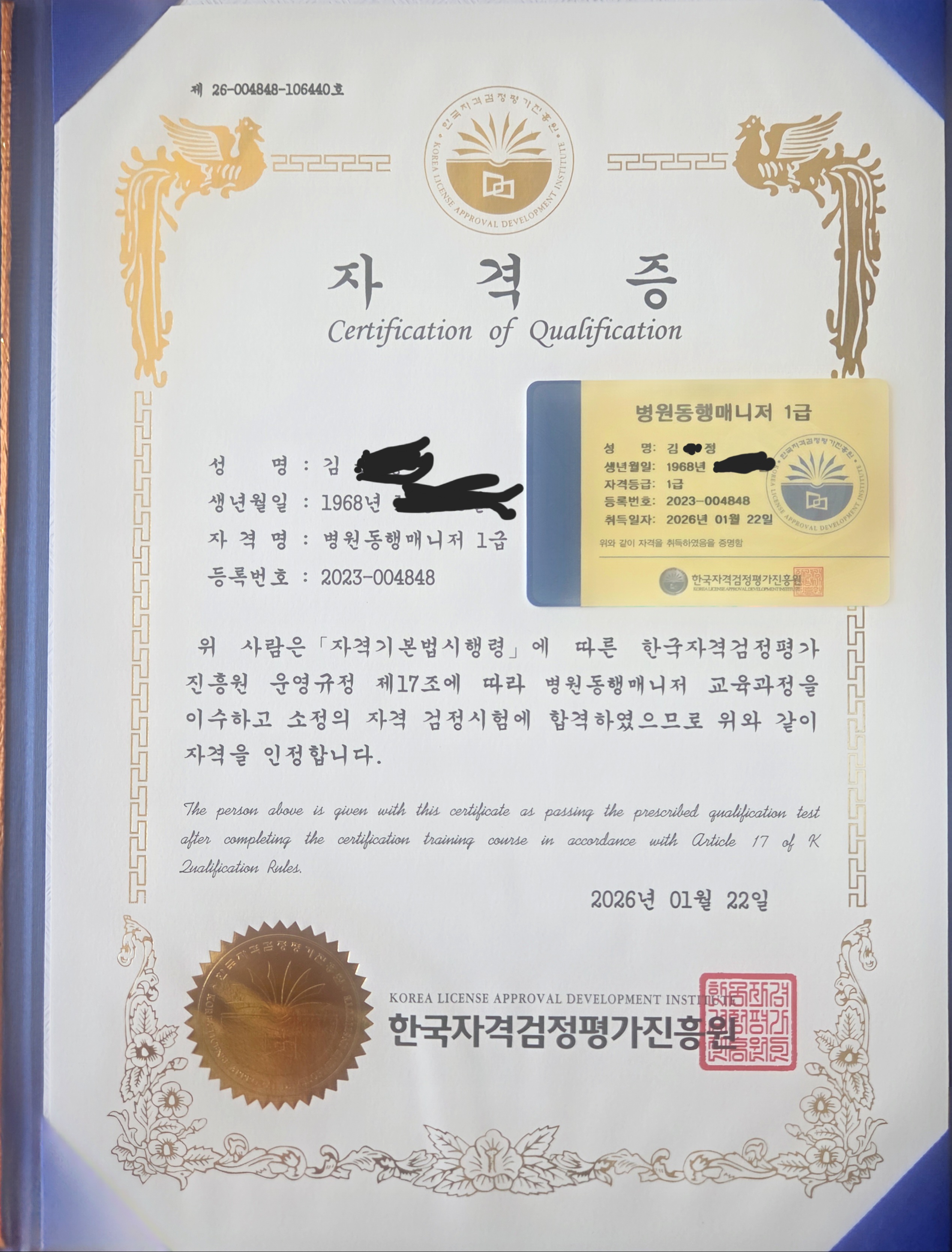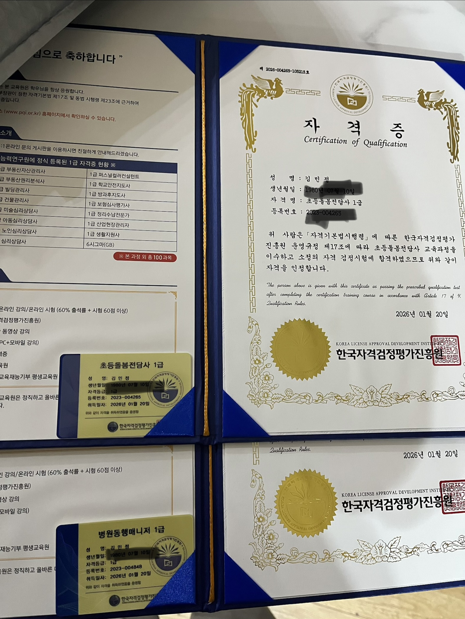 주말 열심히 공부해서 자격증 취득. 요양보호사 따고 병원동행매니저 공부했더니 중복 되는 내용들로 편하게 공부하고 조금 수월하게 취득했네요...온라인 강의만으로 딸수 있다니 너무 편하고 좋습니다.