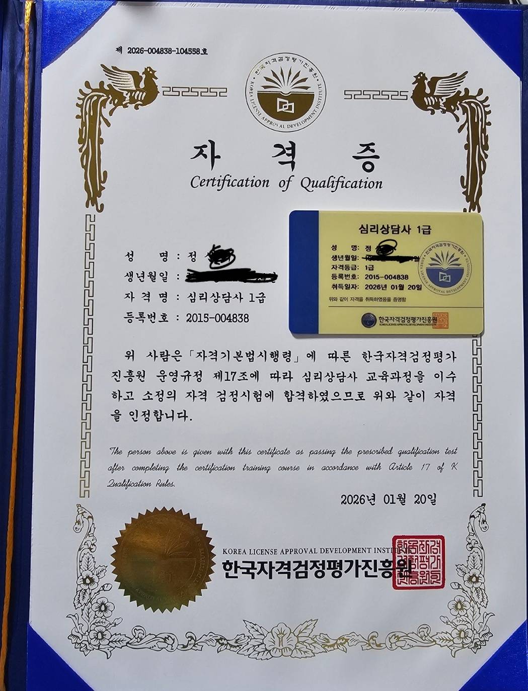 갑자기 관심이 간 심리상담사, 한번 해보자는 마음으로 시작 해보니 은근 재밌고 시간도 잘 갔네요~ 합격못해도 의미있는 시간이였다~ 생각하고 시험을 봤는데!? 왠걸 합격도 했네요 ㅎㅎㅎ 감사합니다~