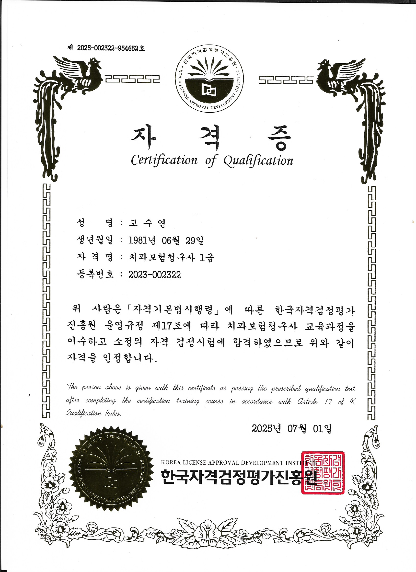 치과에서 오랜 기간 근무하며 보험청구 업무를 직접 해왔기 때문에, 치과보험청구사 1급 자격증은 저에게 새로운 내용을 배우기보다는 그동안 현장에서 해왔던 실무를 체계적으로 정리하는 과정에 가까웠습니다. 한국자격증협회의 온라인 강의는 시간과 장소에 구애받지 않고 수강할 수 있어 바쁜 일정 속에서도 부담 없이 준비할 수 있었고, 특히 이해가 필요한 부분은 반복해서 들을 수 있다는 점이 가장 큰 장점이었습니다. 실무 경험이 있는 사람이라면 강의 내용이 어렵지 않고, 현장에서 익숙했던 보험청구 흐름을 다시 한 번 정리하며 “아, 내가 하던 방식이 맞았구나” 하고 점검할 수 있는 기회가 되었습니다. 무엇보다 온라인 강의라 속도 조절이 가능하고, 필요한 부분만 선택적으로 복습할 수 있어 효율적이었고, 자격증 취득 과정 자체가 부담스럽지 않았습니다. 치과 실무 경험이 있는 분들이라면 기존 경력을 정리하고 전문성을 한 단계 더 보완하는 의미로 치과보험청구사 1급에 도전해볼 만하다고 생각합니다.
