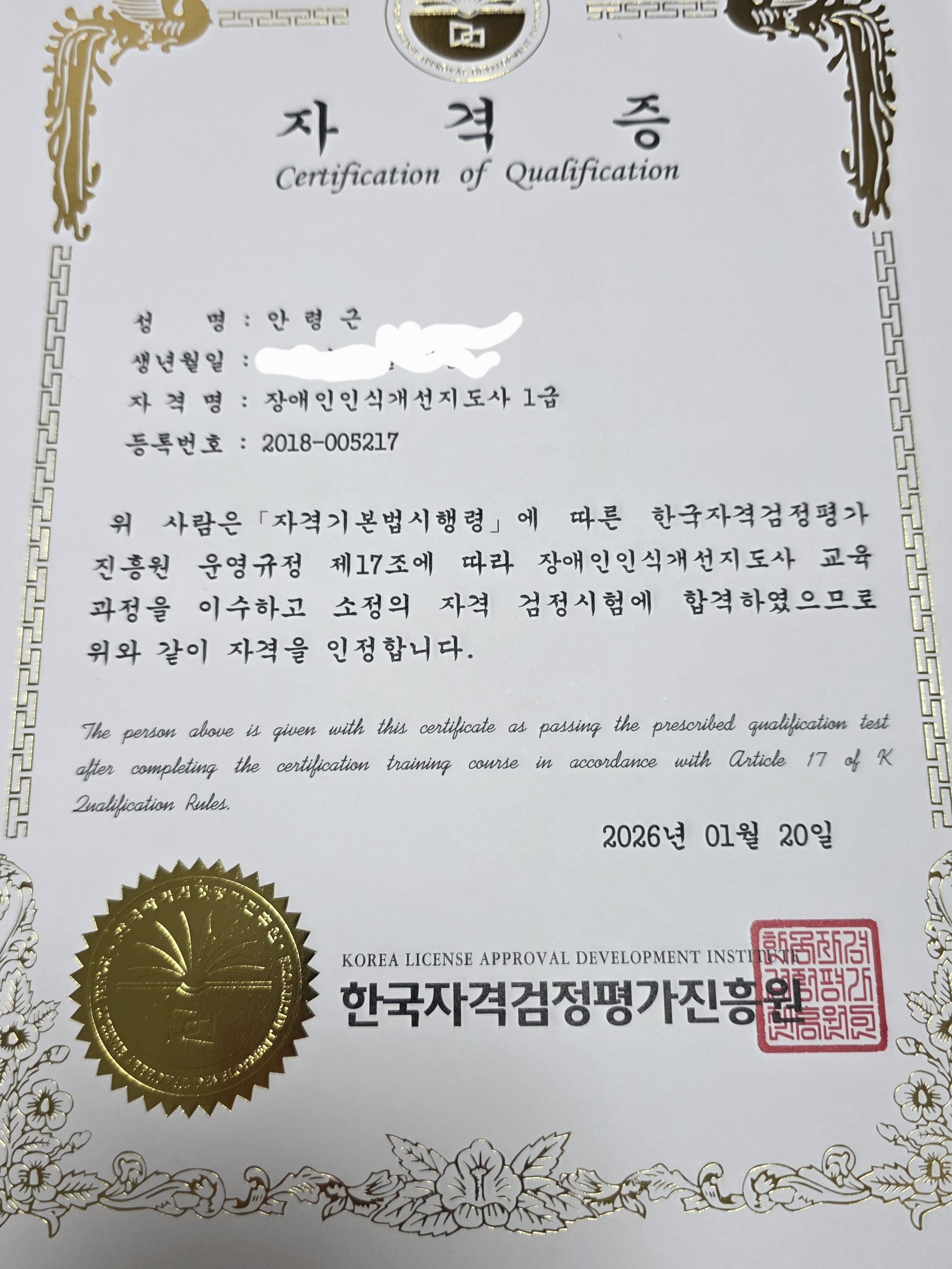 안녕하세요 몸은 불편하지만 자격증을 어떻게 취득할까 고민이었는데 이변 기회에 취득 했습니다 다른 자격증도 도전하고 있습니다.