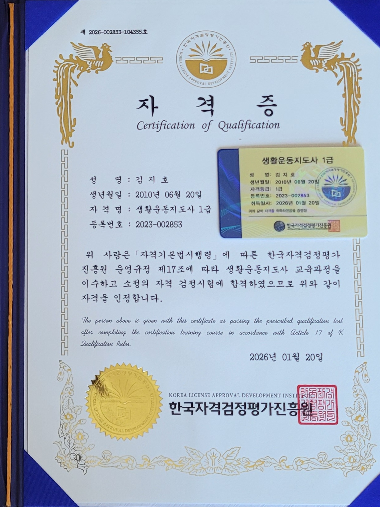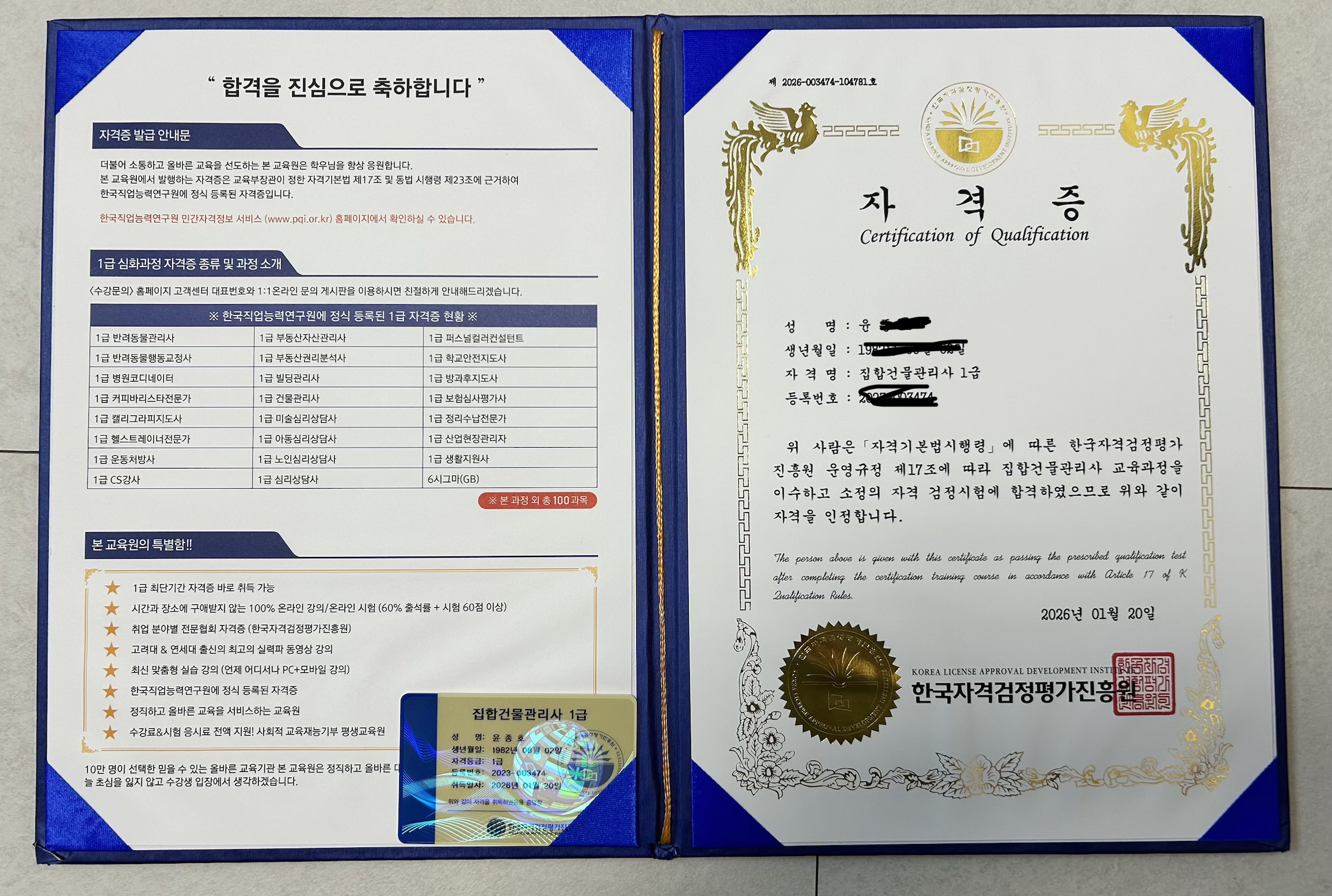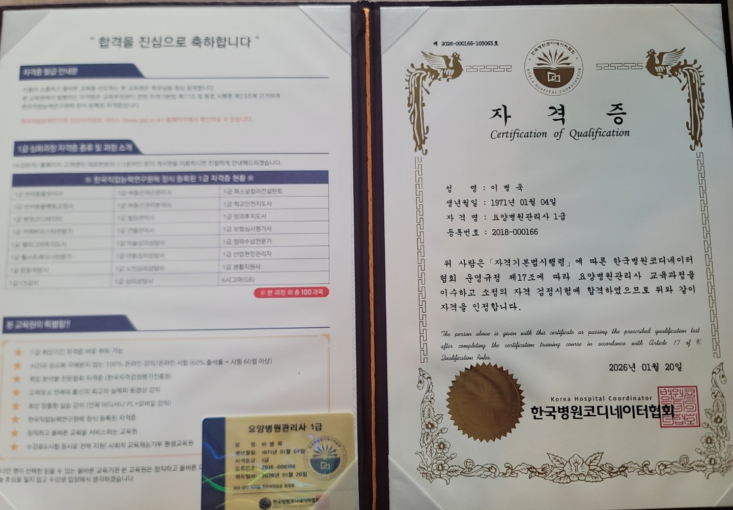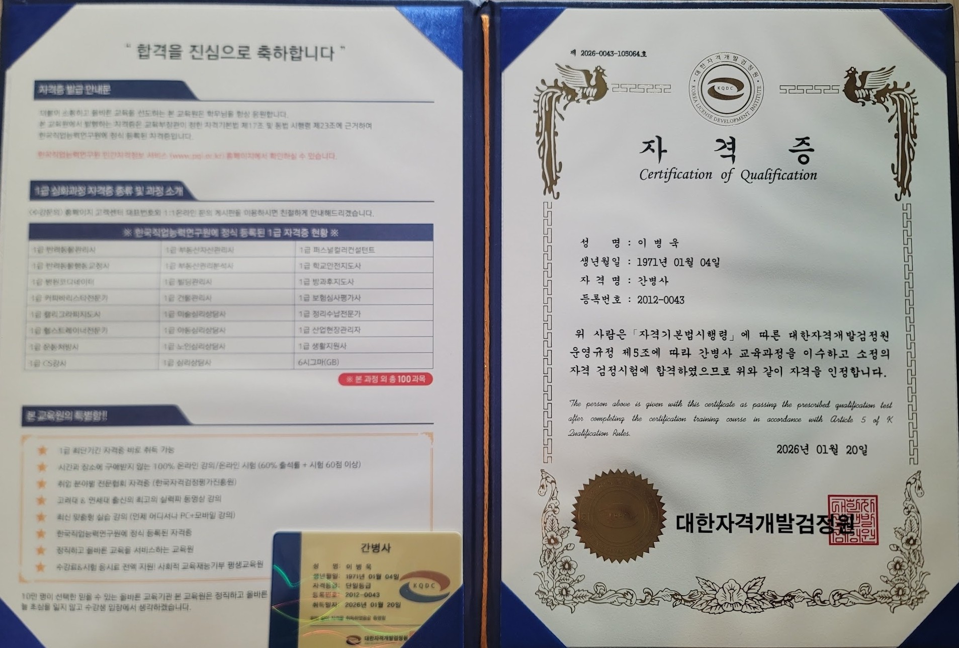 퇴직후 뭘할까 찿다가 요양보호나 간병이 요즘 괜찮은것같아서 자격증을 먼저 취득해서 차후 취업하기에 조금더 수월하지않을까 생각했었는데 마침 한국자격증협회에 원하던 자격이 있어서 요양병원 관리사1급과 간병사 수강하고 자격취득했습니다. 앞으로도 다른자격도 취득할생각입니다.~많은도움되었습니다.~ 감사합니다. 번창하세요~