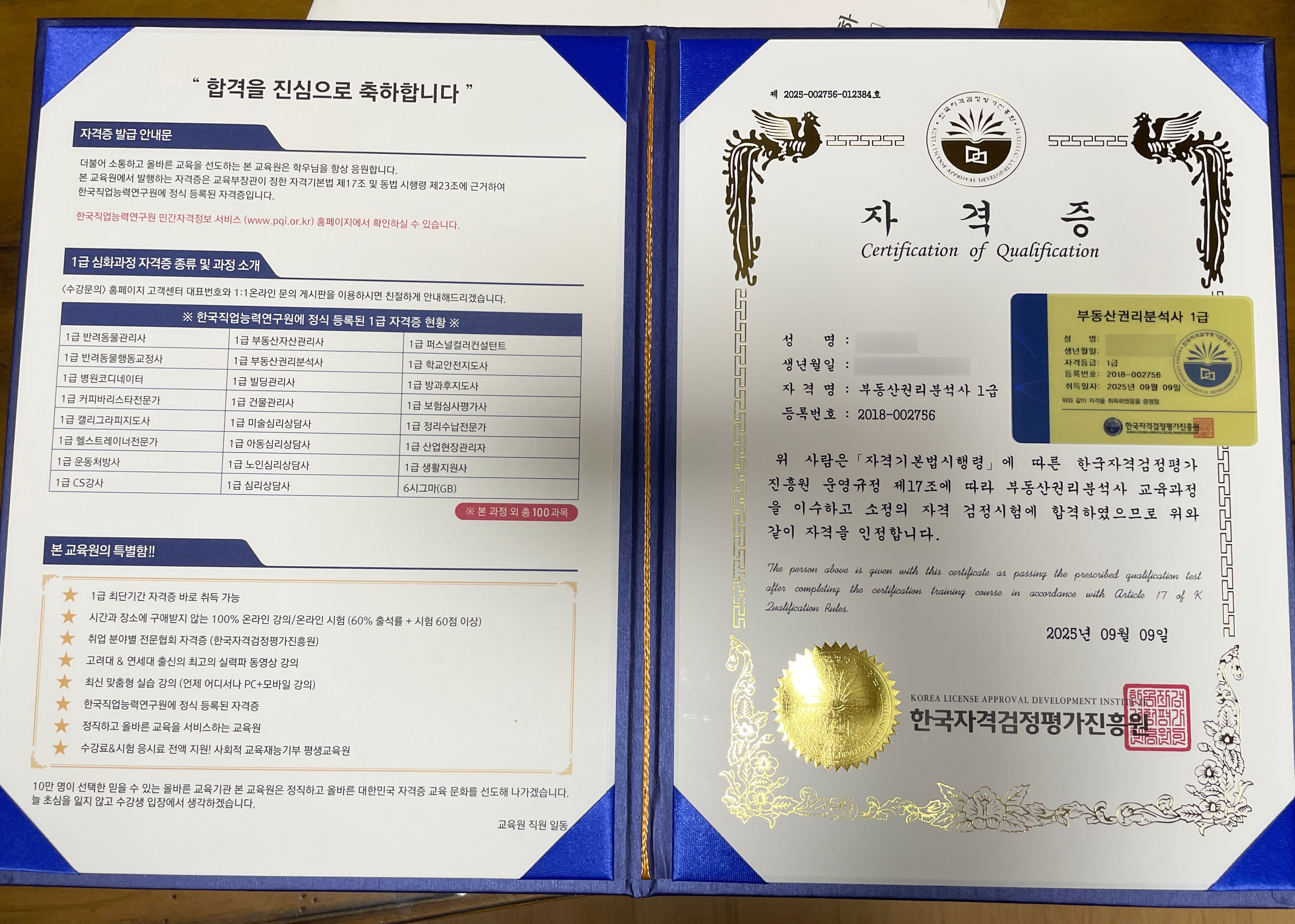 은퇴를 앞두고 제2의 인생을 부동산에서 시작하려고 부동산 관련 책들을 읽고 있던 중 릴스에 뜬 광고를 보고 한국자격증협회를 알게 되었습니다. 부동산 관련 자격증 중에 제일 먼저 눈에 들어온 게 부동산 권리분석 전문가 과정이었습니다. 총25강을 듣고 시험을 통과한 후 이제 부동산 권리분석 전문가로서 제2의 인생을 출발해보려 합니다. 귀한 강의해 주신 교수님께 감사드리고 제2의 인생을 위한 새로운 기회를 주신 협회에 감사드립니다.