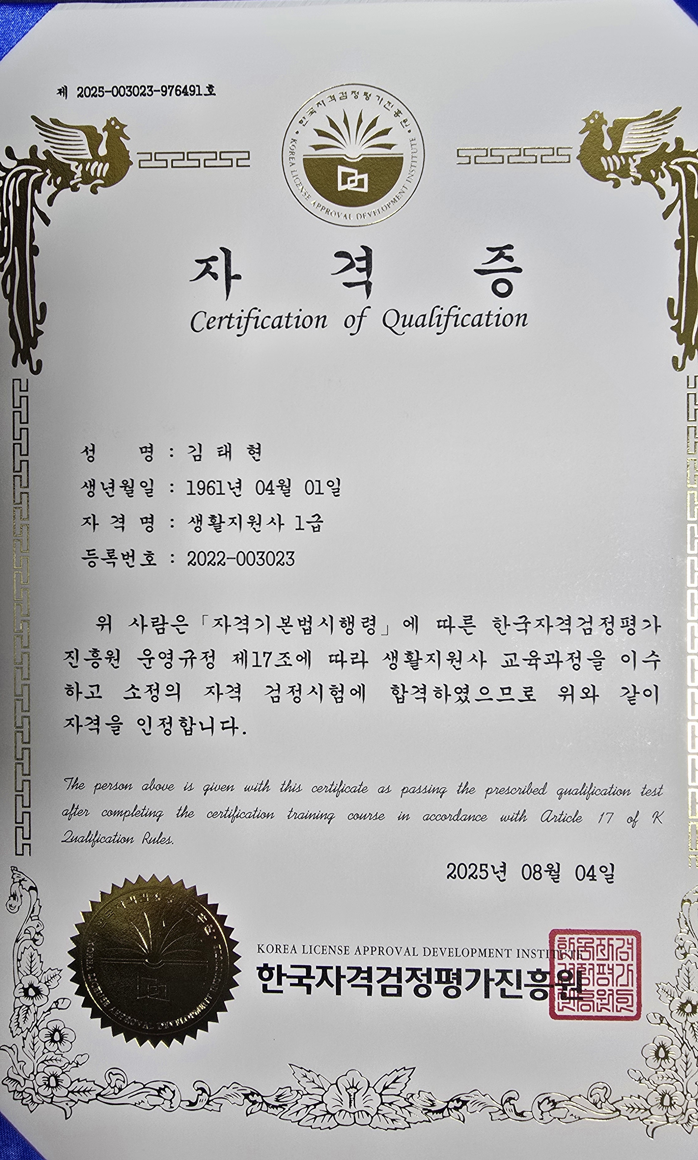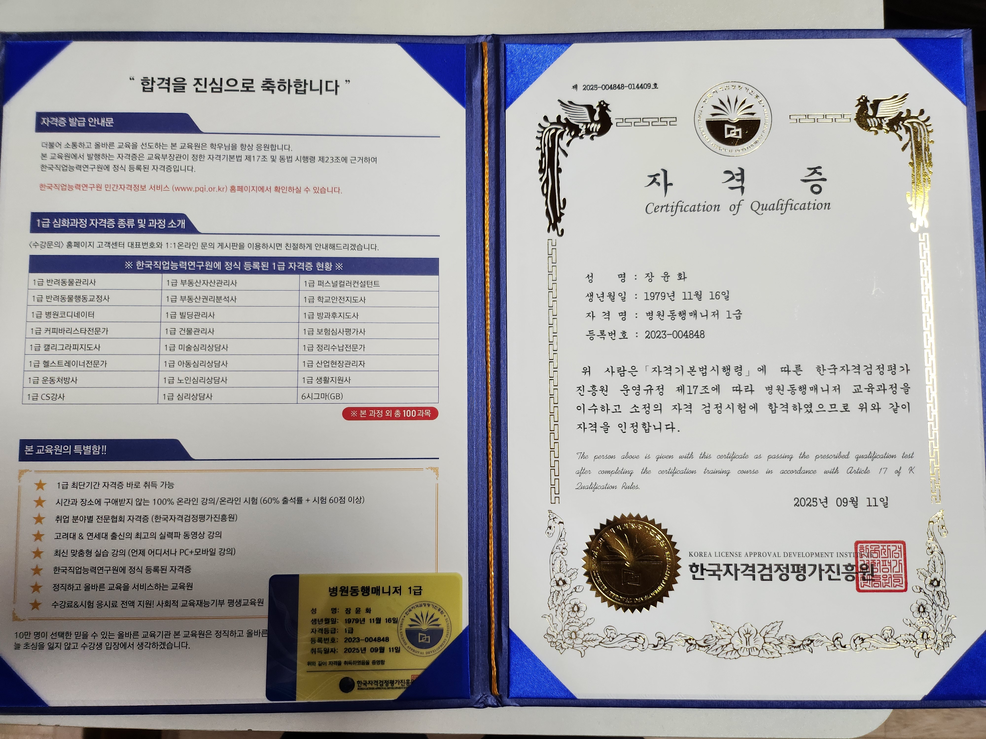 병원에서 간병하면서 시간내어 온라인 강의를 시청 했는데 강의가 싶고 내용이 머리에 쏙쏙 들어오고 시험도 단번에 합격하여 관련자격증 발급 받았습니다 감사합니다