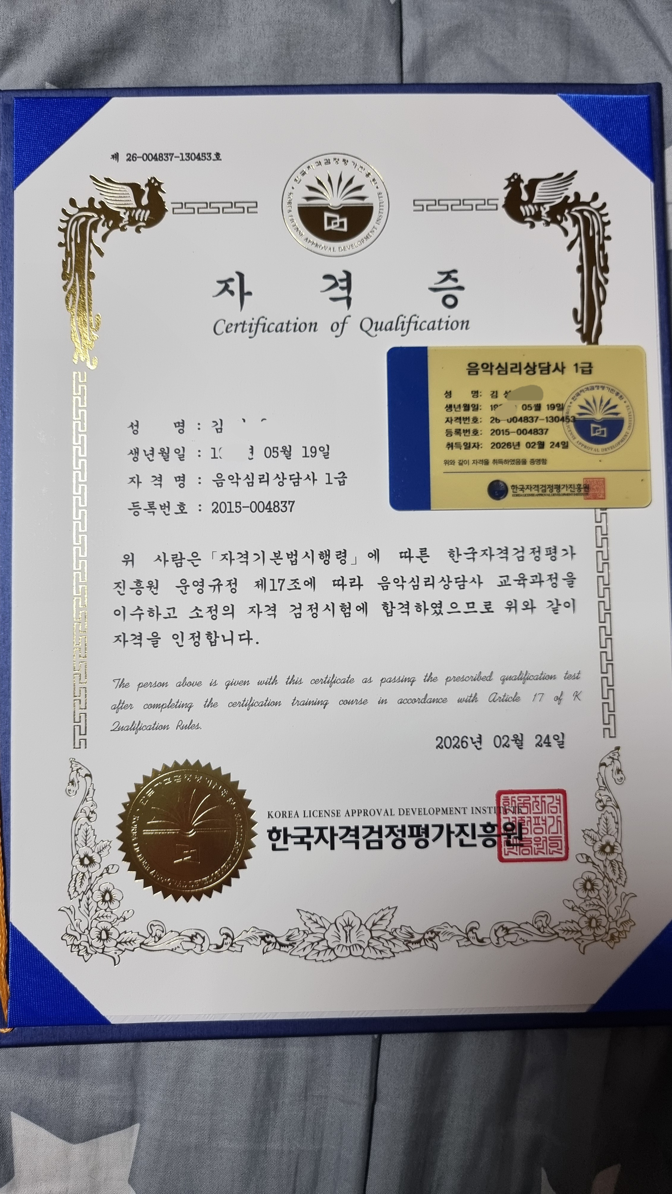 세번째 자격증 음악심리상담사도 무난히 잘 공부하고 땄습니다. 좋은 강의로 배운것도 많고 앞으로의 창업에 도움이 많이 될 것 같아요!