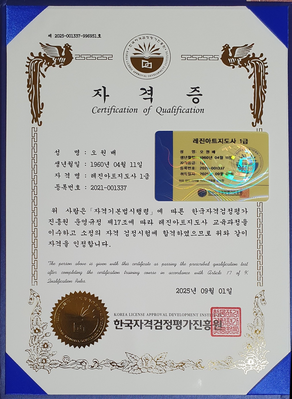 강사님 감사합니다. 무료로 강의를 들을 수 있는 기회를 주셔서 감사합니다. 자격증 어디서 따야할지 고민이 있었는데 자격증 종류도 많고 제가 원하는 자격증을 따서 너무 좋습니다 오래전부터 레진공예를 배우고 싶었는데 열심히 활용하겠습니다. 감사합니다.