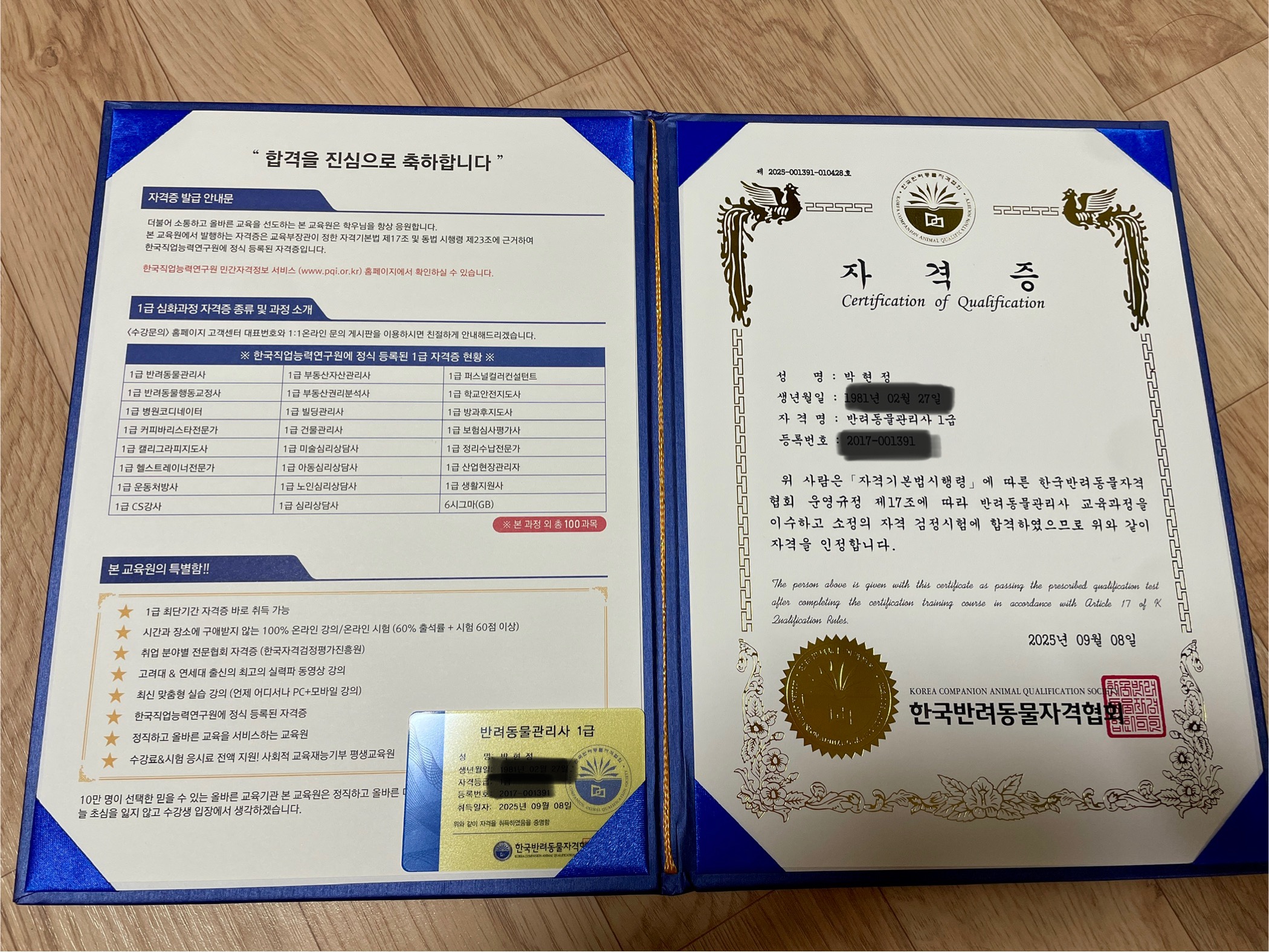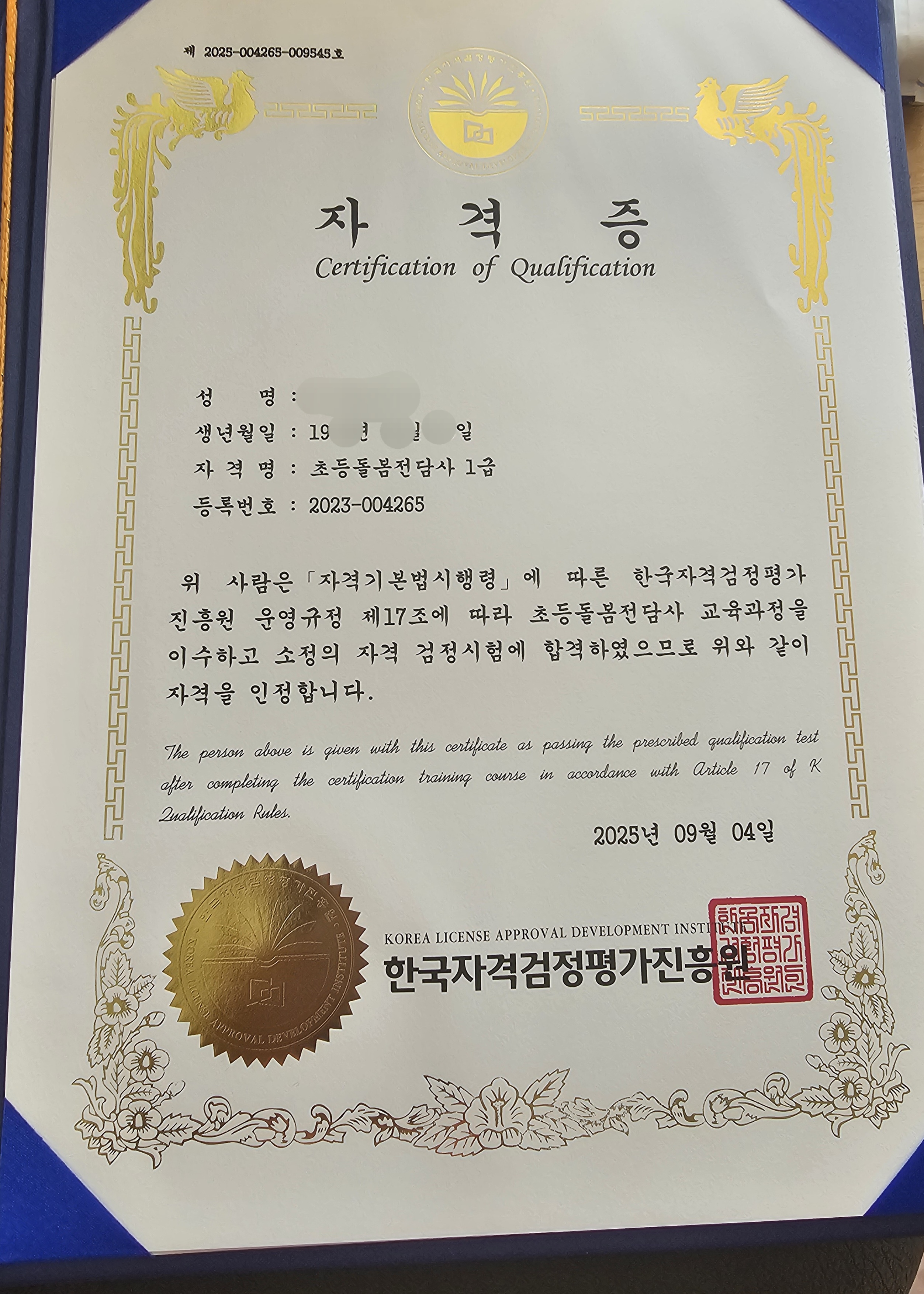 안녕하세요 초등돌봄전담사 자격증을 드뎌 취득했습니다. 강의내용도 너무 탄탄해서 듣는데 넘 도움이 많이 됐고요.따고싶은 자격증이 너무많이 고민이지만 연관 관련 자격증을 더 취득하고싶은 욕심이 생깁니다. 감사합니다.