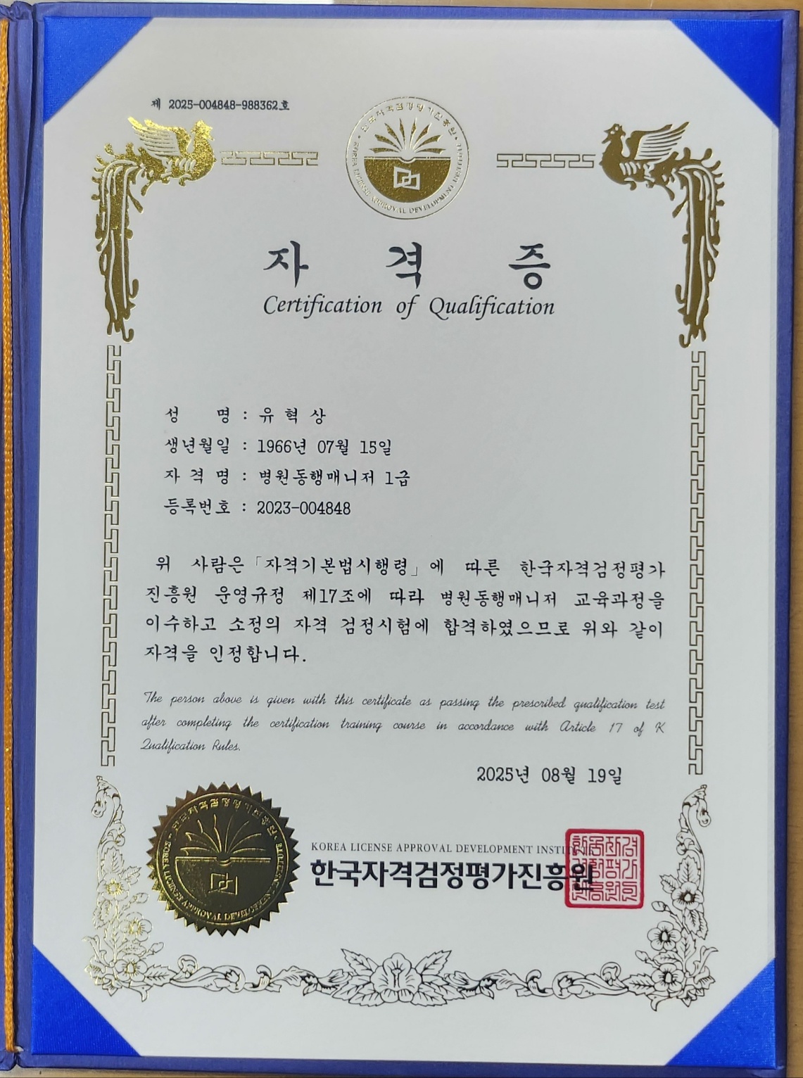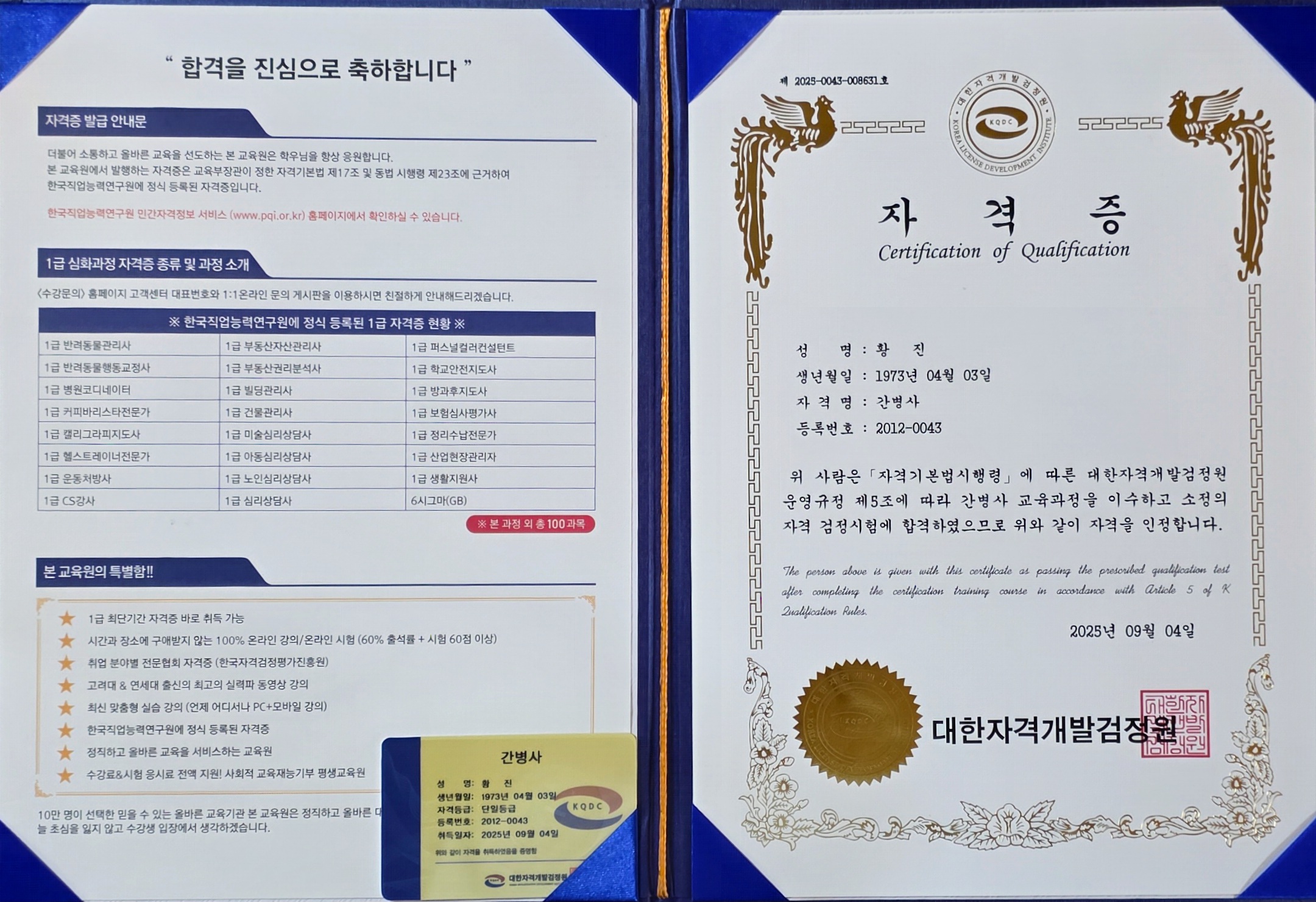 사실 큰 기대하지 않고 수강했는데 이렇게 자격증을 취득하고 나니 합격의 기쁨보다 잘 해낼 수 있을까에 대한 무거운 책임감이 드네요. 약자를 도울 수 있다는 사실이 기쁩니다.