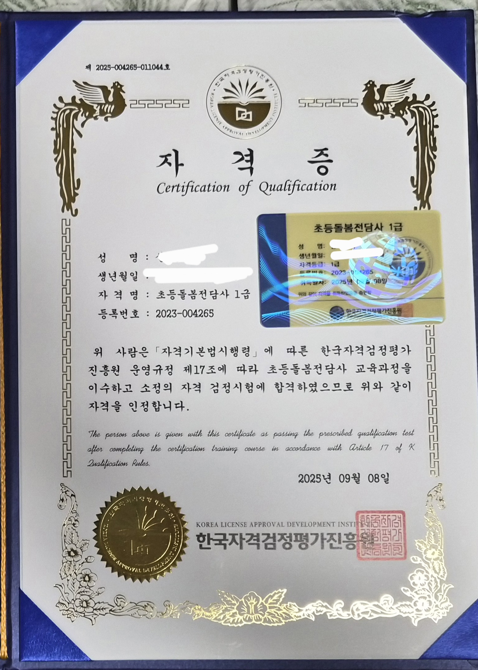 초등학생대상으로 수업을 하는데 조금 더 관심이 있어 자격증을 알아보는중 초등돌봄전담사자격증있어 한번 수업을들어봤는데 수업이 알차고 도움이되는내용이많아 직업능률적으로도움이 되는것같아요