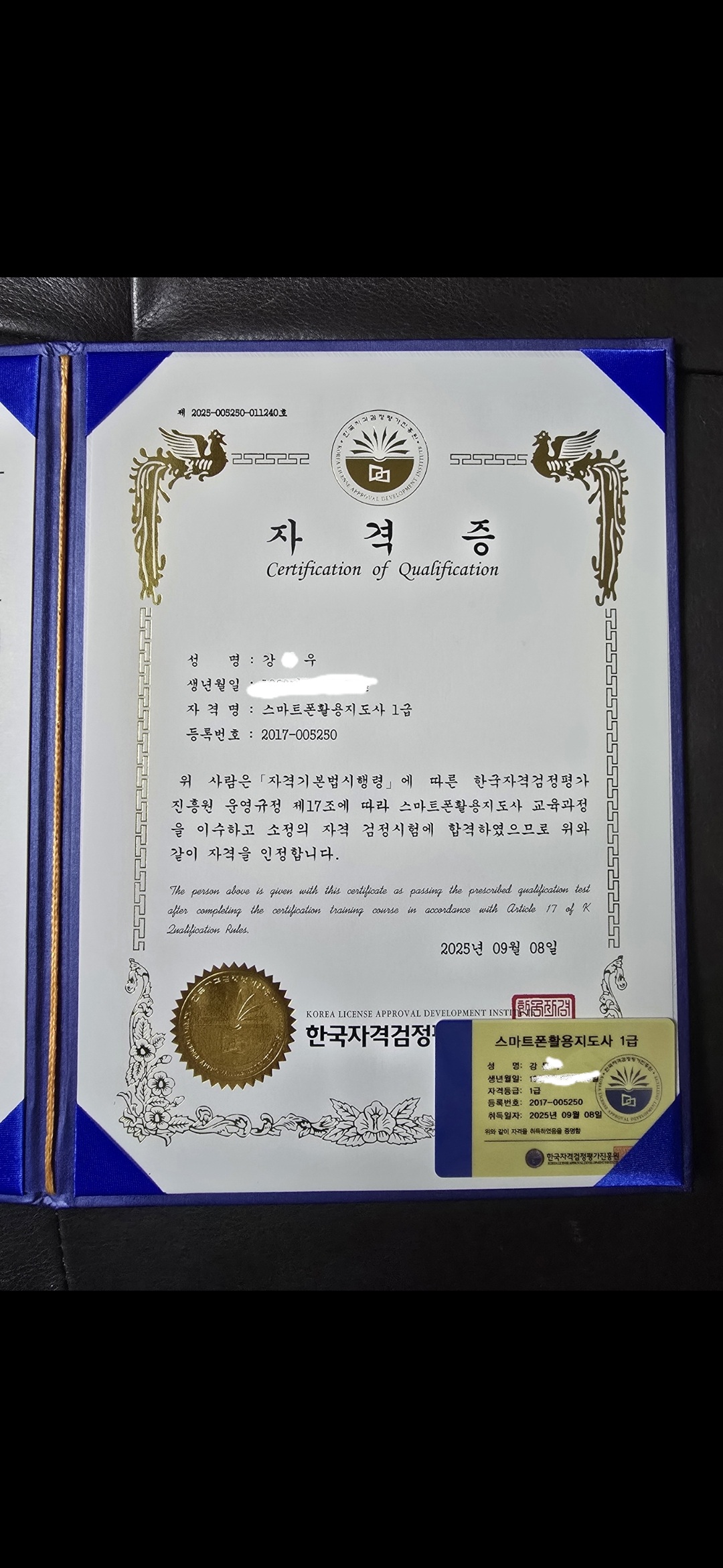 원하던 스마트폰 활용 지도사 1급 자격증을 취득하게 돼서 너무 기쁩니다. 교수님이 강의를 쉽게 지도해 주셔서 따라하기 쉬웠습니다. 감사합니다^^
