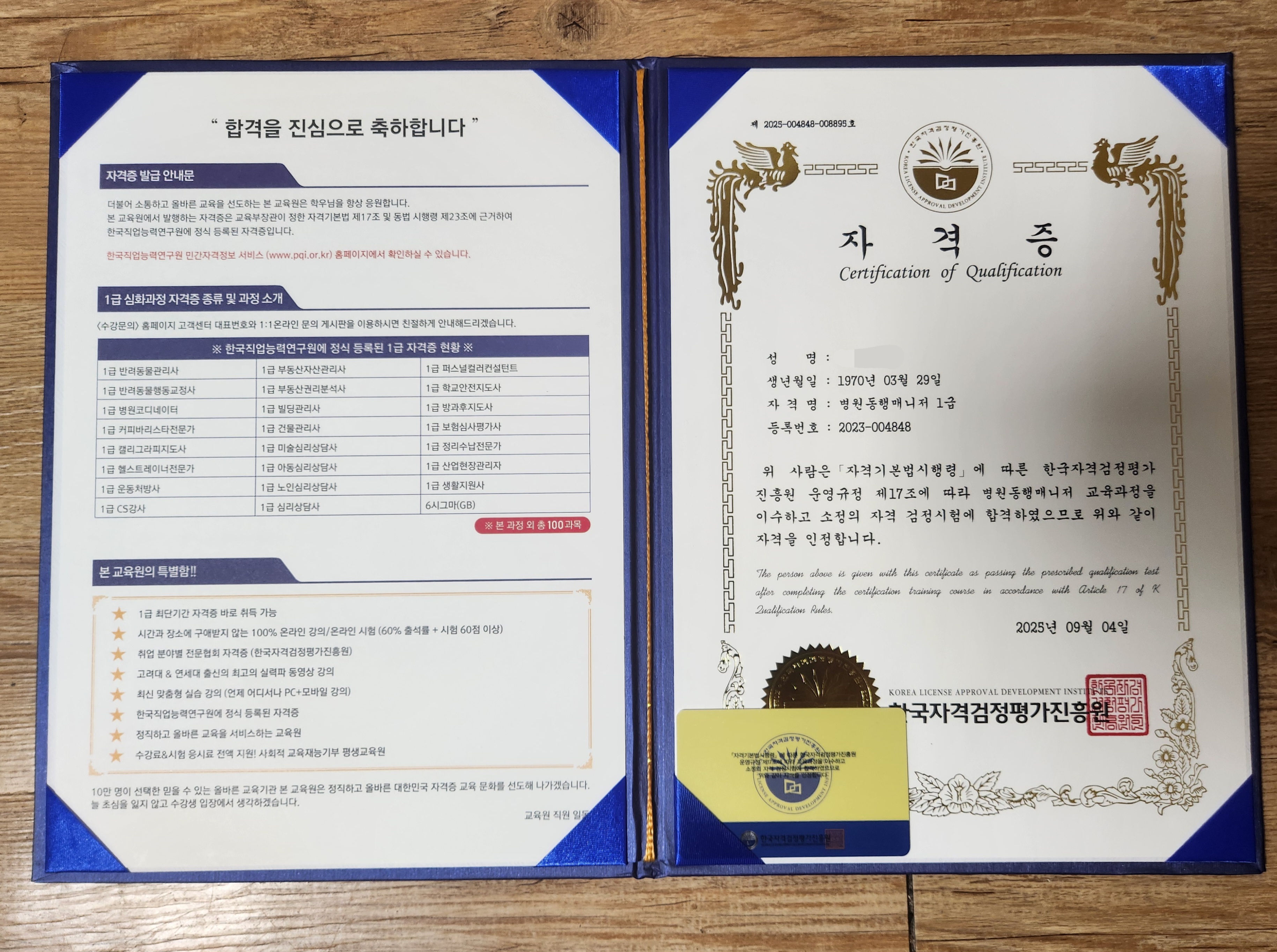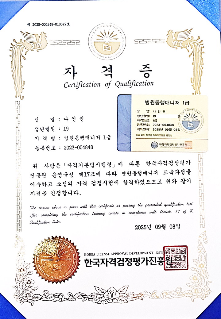 병원동행매니저에 대해 잘 몰랐는데 공부를 하고 나니 정말 좋은 자격증이라는 생각이 무척 듭니다. 인제 2번째 자격증입니다. 앞으로도 더 많은 자격증 취득을 위해 열심히 노력하겠습니다.