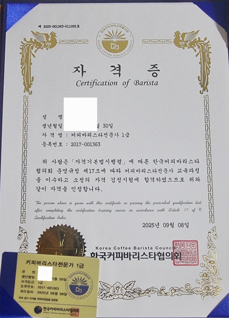 커피바리스타전문가 1급 자격증을 취득하게 되어 기쁩니다. 노력한 만큼 값진 결과를 얻어 뿌듯하며, 앞으로도 커피에 대한 열정을 이어가겠습니다. 감사합니다.