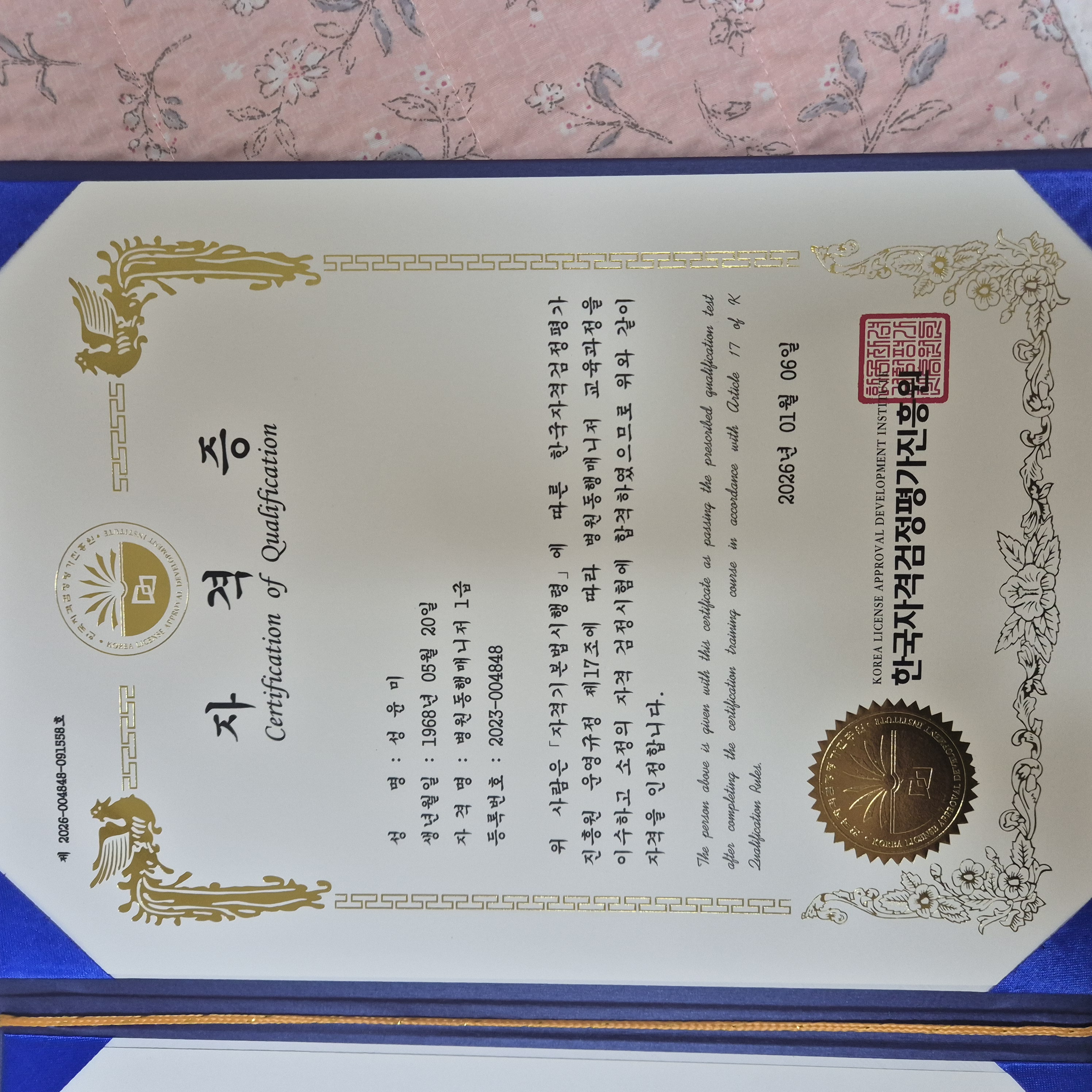 작년 5월 회사가 사업을 정리하며 뜻하지 않는 퇴직을 하게되어, 오히려 잘됐다 생각하고 나름의 노후 준비를 위한 국가자격증 취득 공부를 하게되었습니다. 하지만 학습 진도는 더디기만하고 난이도 또한 너무 높아 포기해야하나 갈등중에 우연히 유품정리사 라는 자격증이 있다는 것을 알게되었습니다. 일단 하던 공부는 잠시 머리도 식히고 좀 더 고민해 보는 시간을 갖기로 하고, 대신 유품정리사 학습을 곧바로 시작하였습니다. 결과는 학습시작 일주일 만에 벼락치기로 시험까지 끝내고 이렇게 자격증을 받았습니다. 앞으로 이 자격증이 쓰임이 있을지 없을지는 모르겠지만 막연하게나마 시작이 좋다는 느낌을 받았습니다.. 감사합니다..