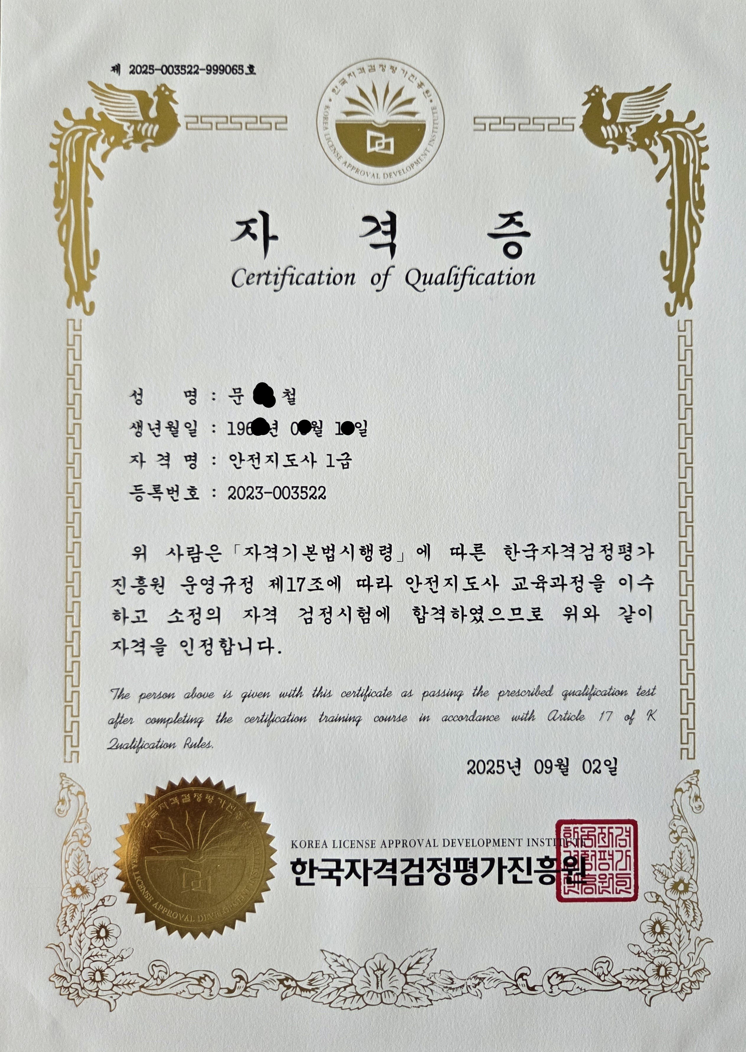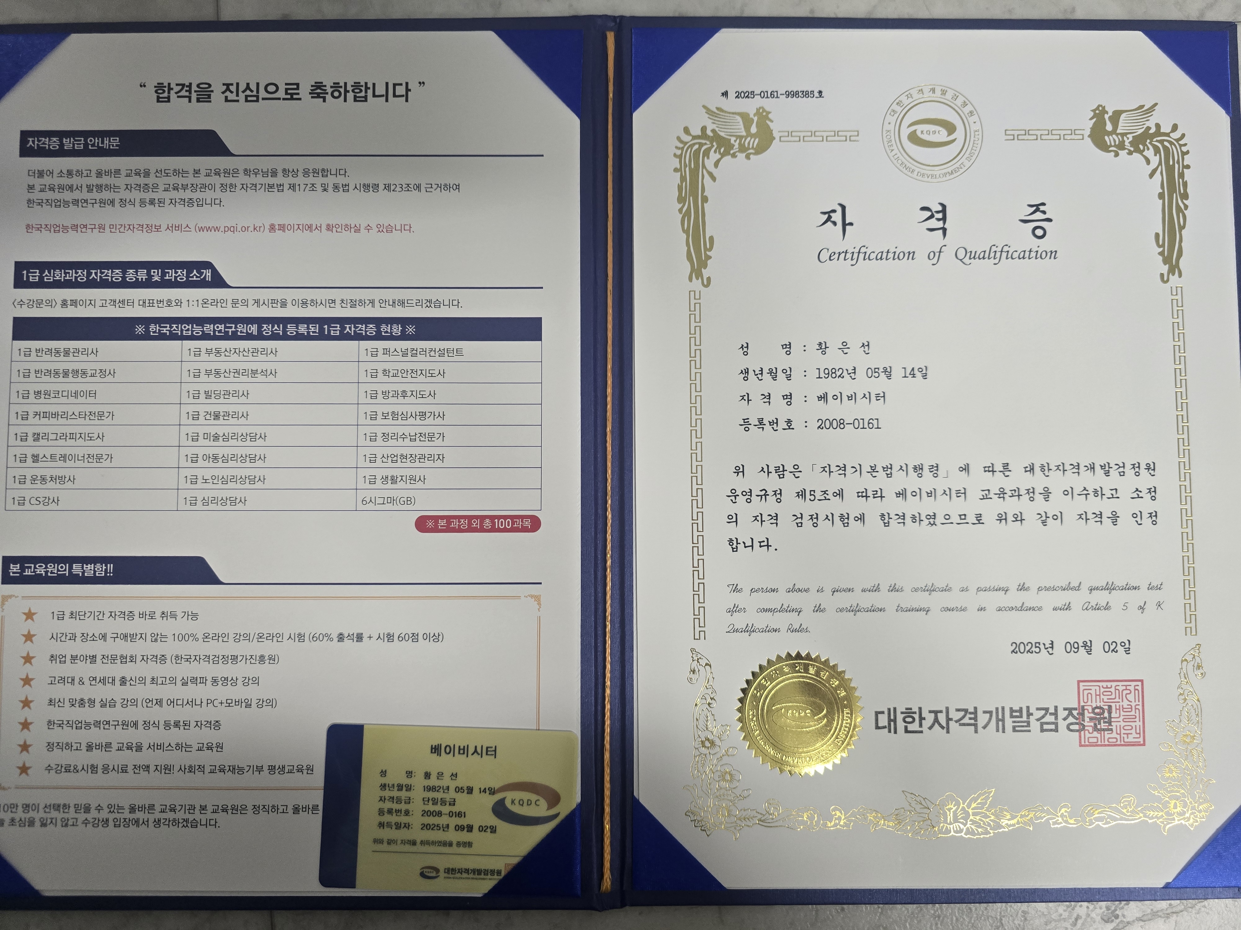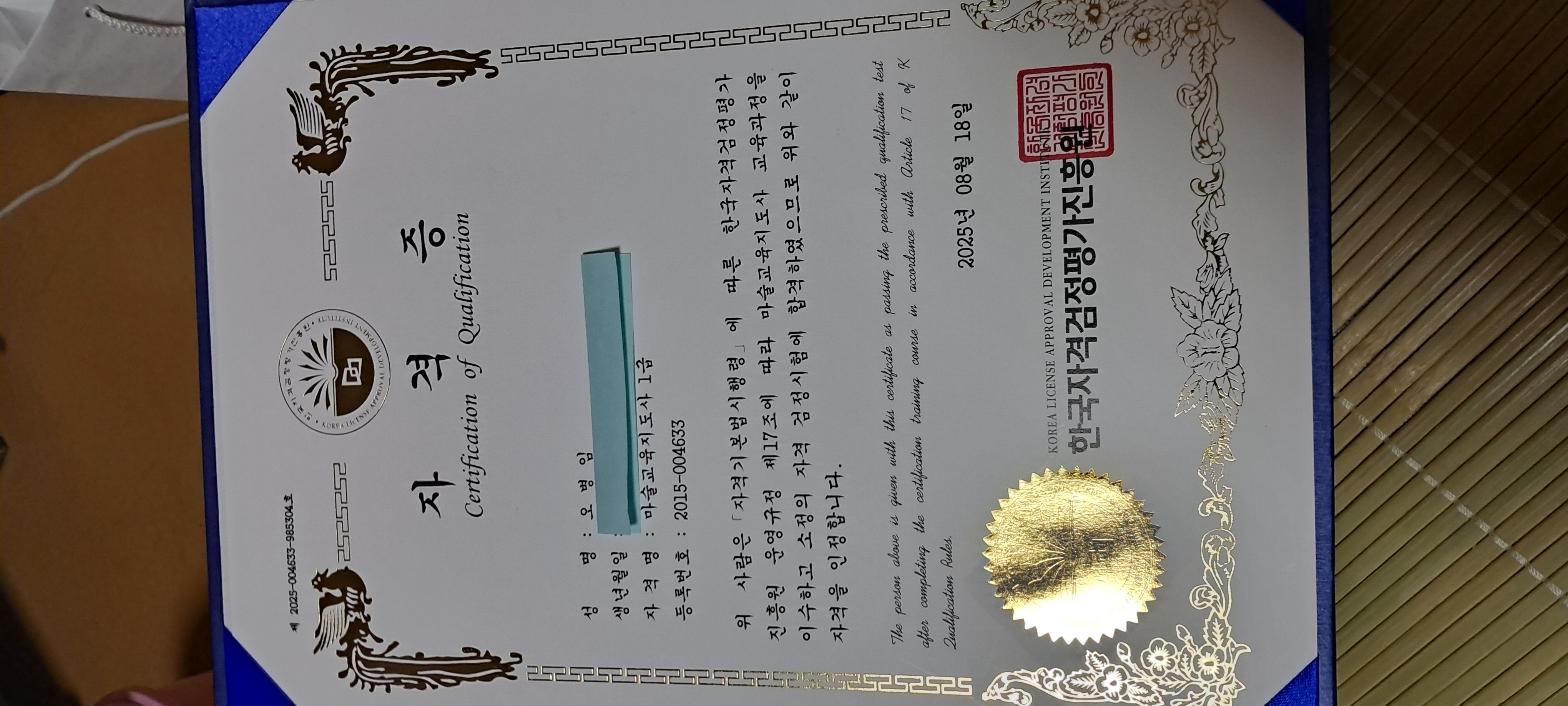 안녕하세요^^ 50대의 인생에 새로운 도전으로 자격증을 취득했습니다. 뿌듯함과 동시에 나도 할 수 있다는 자신감이 생겼어요. 감사합니다.