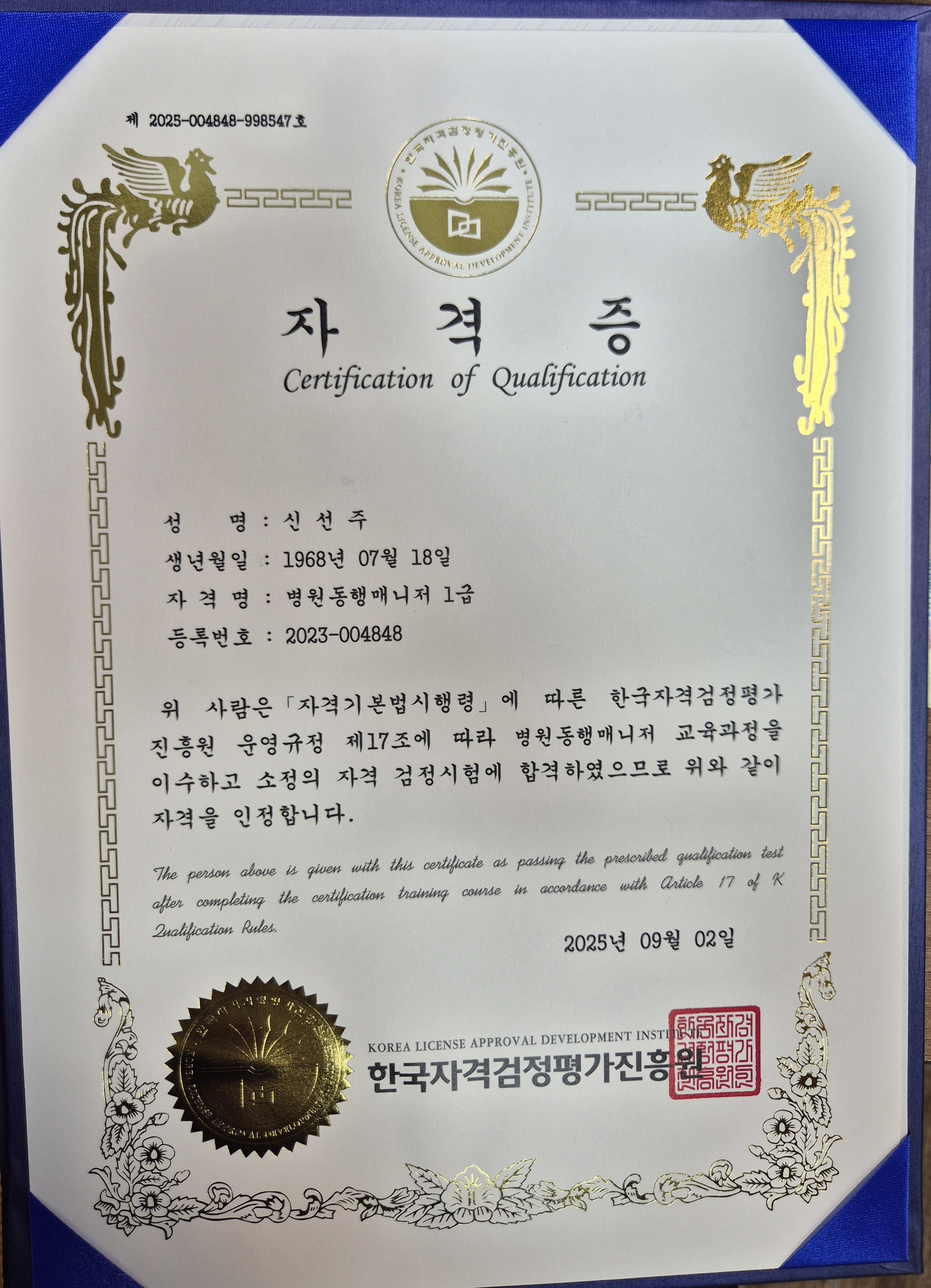 아픈 부모님을 모시다 자연스럽게 접하게 되었는데 자격증을 따게되서 정말뿌듯하다