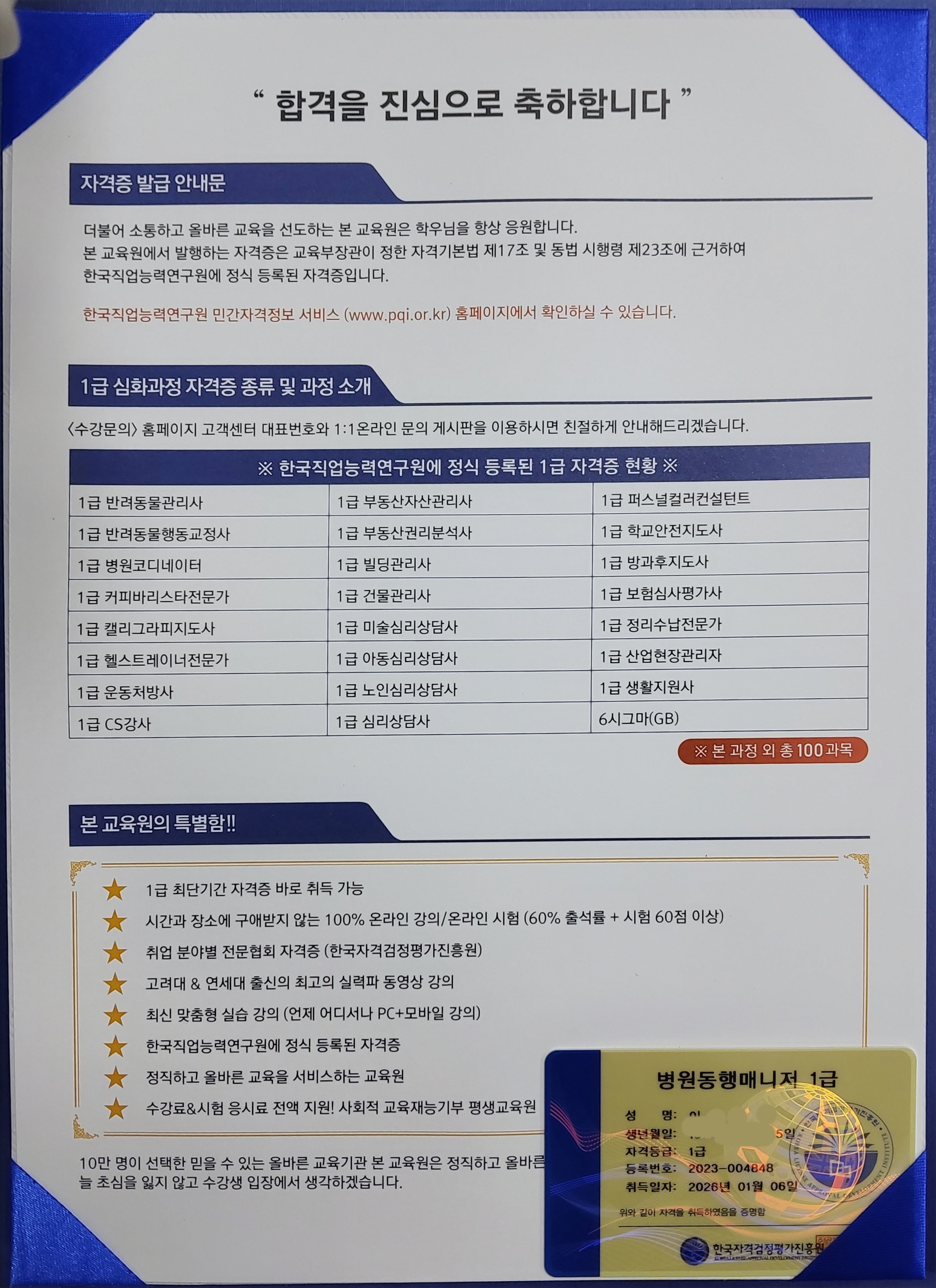 한국자격증협회에서 마련한 훌륭한 학습시스템과 학습자료를 통해서 운동처방사 자격을 갖추기 위한 공부를 시간과 장소에 구애 받지 않고 꾸준히 할 수 있었습니다. 마챔내 자격증도 취득하였습니다. 다시 한 번 감사드립니다.