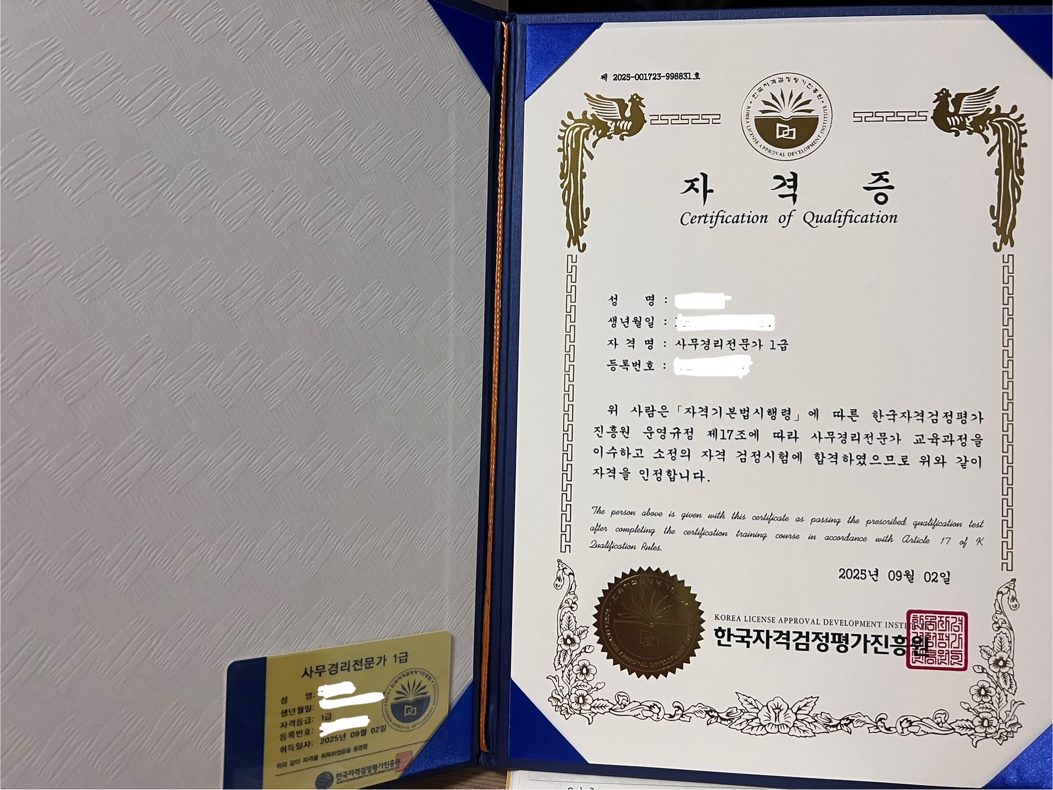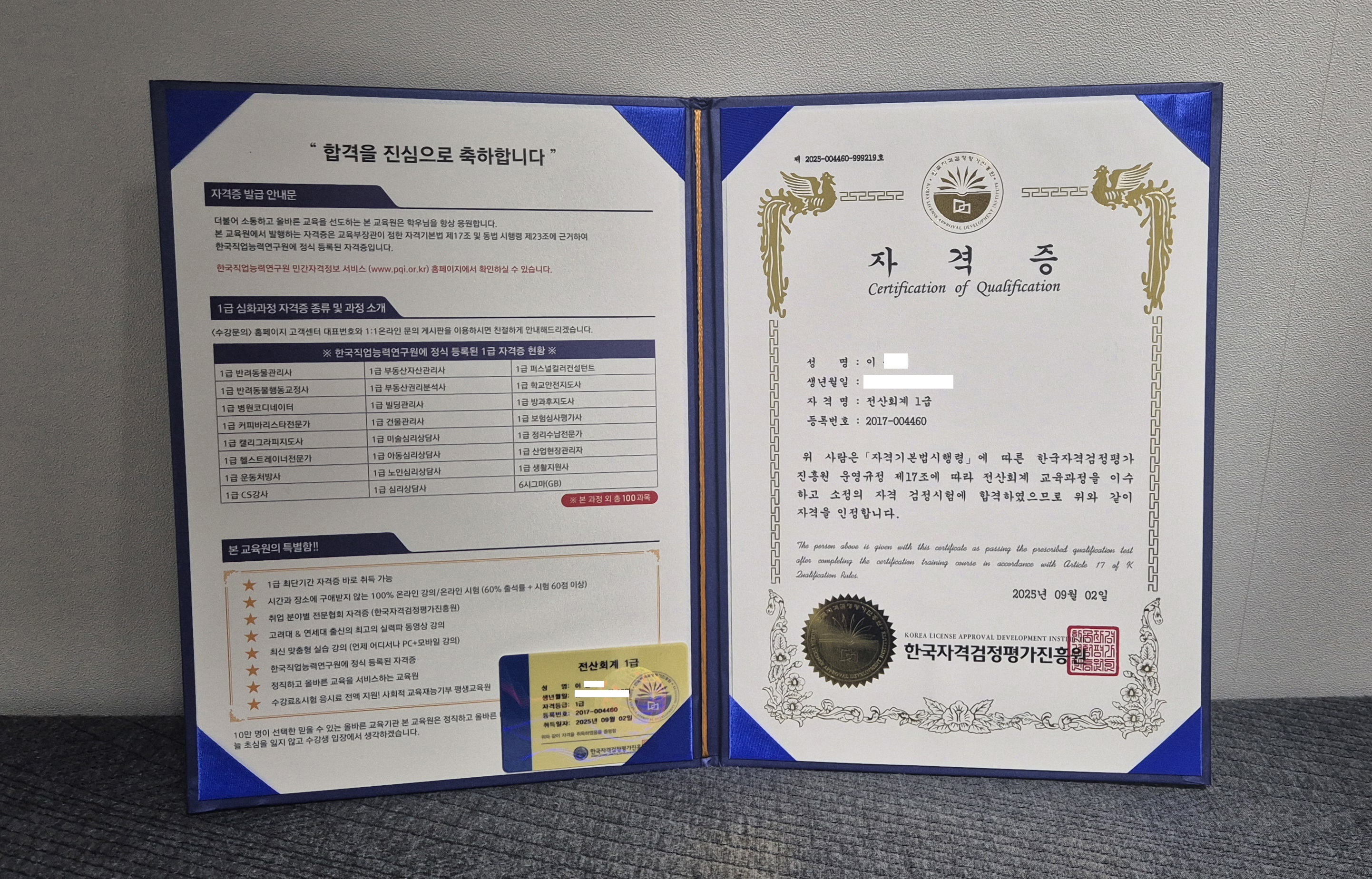 안녕하세요, 저는 현재 직장에서 관리직 업무를 맡고 있는 직장인입니다. 늘 회계와 행정 업무를 처리하며 '더 나은 미래를 위해 스스로를 발전시켜야겠다'는 생각을 해왔습니다. 진급과 연봉 인상이라는 목표를 이루기 위해선 전문성을 강화하는 것이 필수적이라고 판단했어요. 그래서 오랫동안 고민해왔던 회계 자격증 취득에 도전하기로 결심했습니다. 어떤 자격증부터 시작할까 고민하던 중, 한국자격증협회의 전산회계 1급 과정을 알게 되었습니다. 직장 생활과 병행하며 공부해야 했기 때문에 효율적인 커리큘럼과 체계적인 지원이 가장 중요했는데요. 협회에서 제공하는 강의와 자료들이 저에게 딱 맞았습니다. 바쁜 업무 시간 틈틈이 강의를 듣고 복습하며 꾸준히 준비한 결과, 마침내 전산회계 1급 자격증을 취득할 수 있었습니다. 이렇게 합격 후기를 작성하고 자격증을 손에 쥐게 되어 정말 기쁩니다. 이번 합격을 통해 회계 지식을 한 단계 더 끌어올릴 수 있었고, 제 꿈에 한 발짝 더 다가간 것 같아 뿌듯합니다. 이 모든 기회를 제공해주신 한국자격증협회 모든 관계자분들께 진심으로 감사드립니다. 앞으로도 꾸준히 노력하여 더 성장하는 모습을 보여드리겠습니다. 감사합니다!