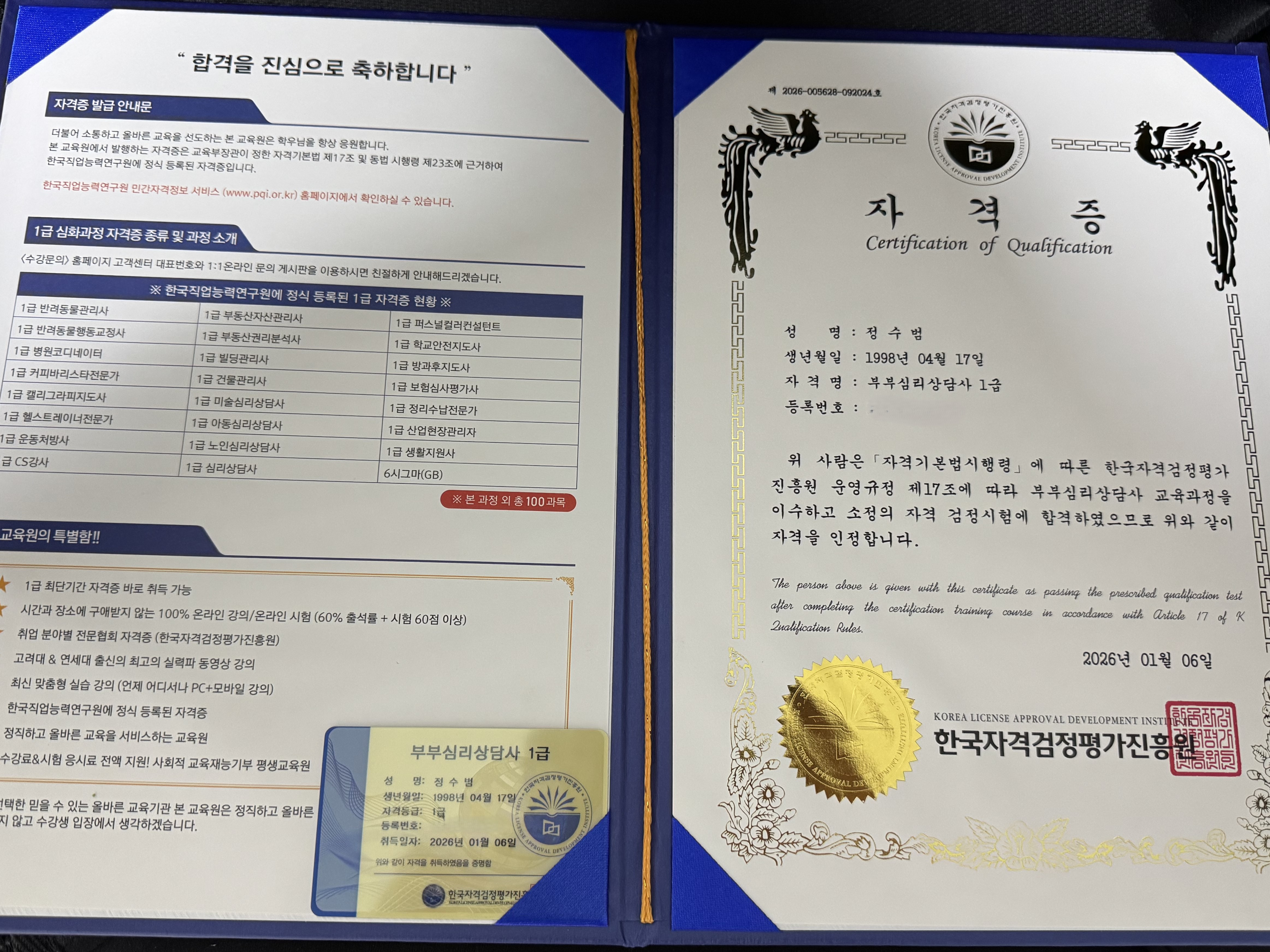 유튜브 광고에 계속 뜨길래 뭔데 저렇게 광고가 엄청뜨고 사람들이 궁금해 하는거지 하면서 그냥 한번 들어갔다가 재미있을것 같고 제 커리어에 도움이 될것같아 쉬는시간마다 강의들으면서 공부하고 시험치니까 한번에 부부심리상담사 1급을 땃네요 다음에는 다른것도 따볼려고합니다 다른사람들에게 엄청 추천하고있어요!