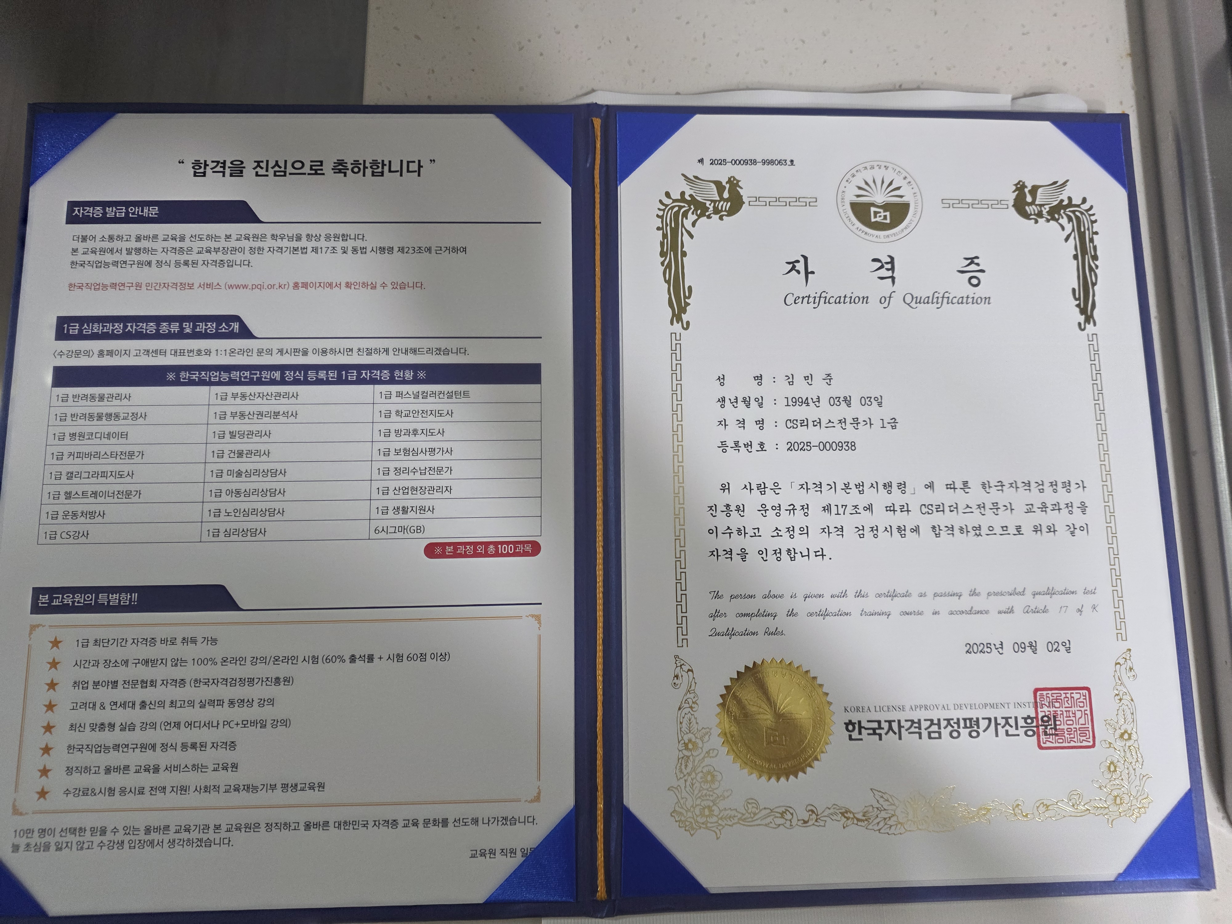 슈퍼바이저 준비하는동안 뭘 먼저해야되나 싶었는데 찾아보던중 cs리더스 자격증을 보고 강의보고 공부했는데 강의도 너무 잘되있고 좋았어요!!감사합니다