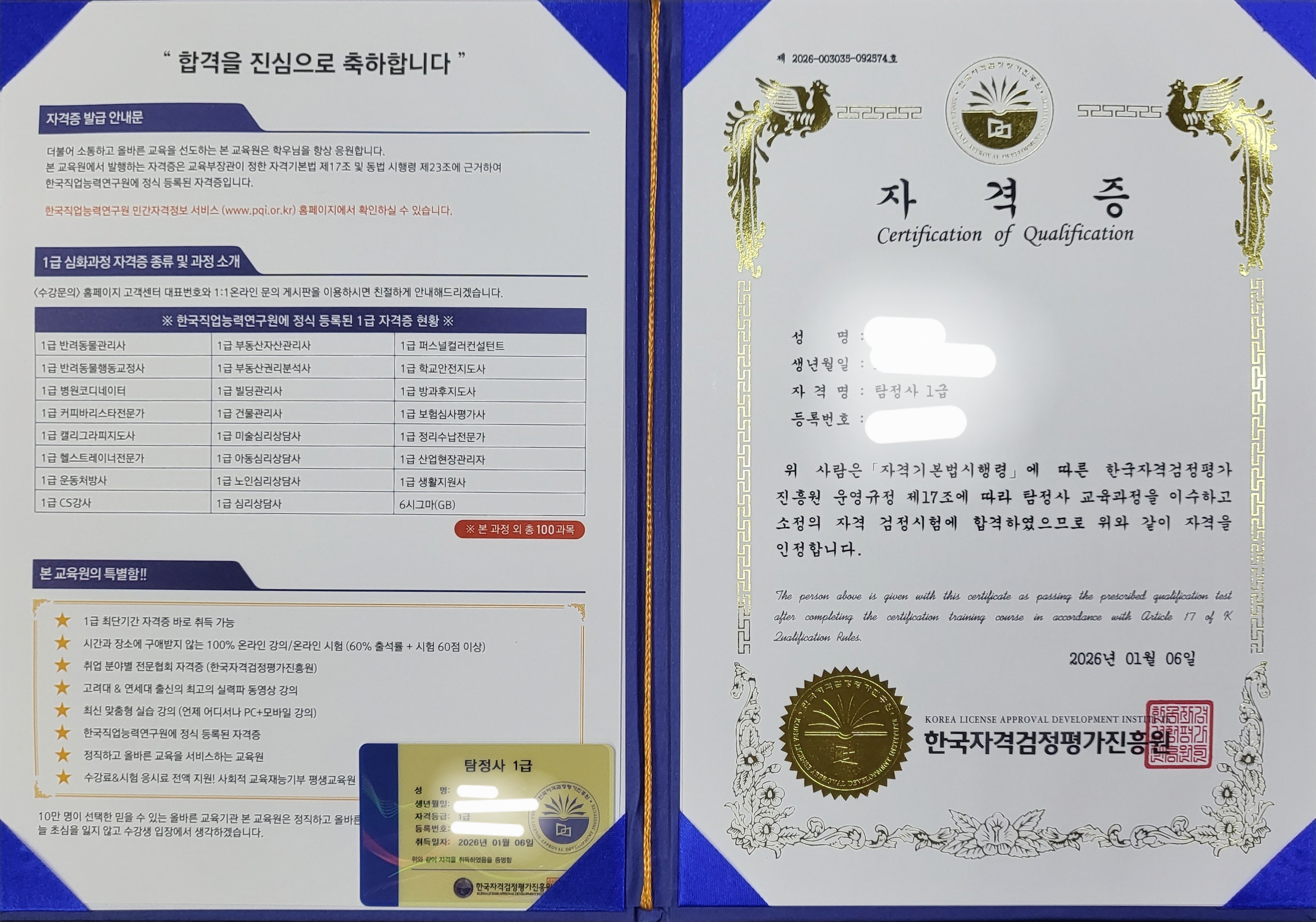 좋은 기회로 이렇게 자격증 취득까지 하게되다니 감사할 따름이에요ㅠㅠ 최근 왠지모를 무기력함 투성에 급격한 우울감이 심했었는데 우연히접한 탐정사 공부로 요즘 활력이 오를게 제 삶까지 바꿔놨어요ㅋㅋ 탐정사 외에도 평소 궁금했었던 과목들이 꽤 많아서 차근차근 도전해보고싶네요^^