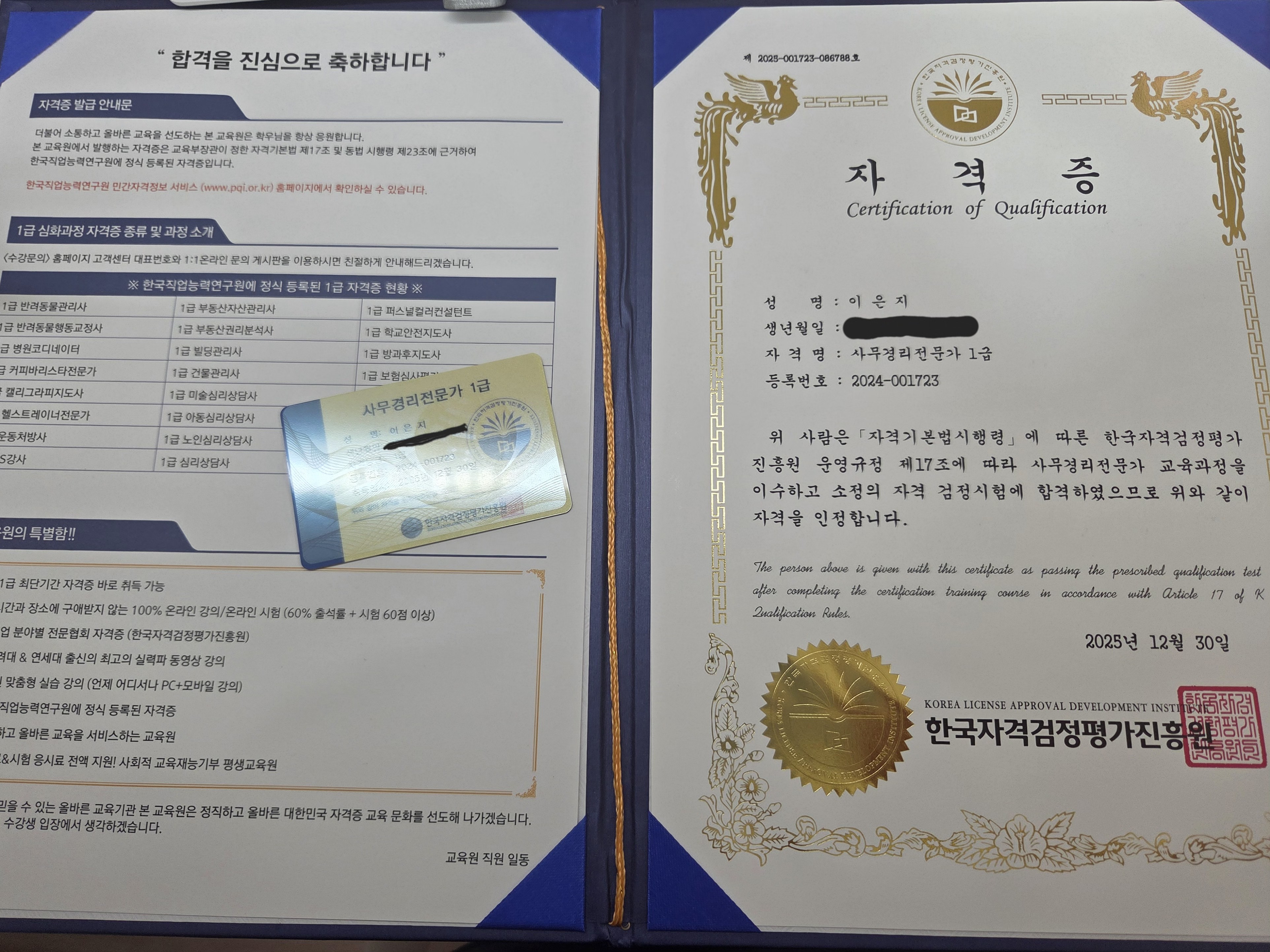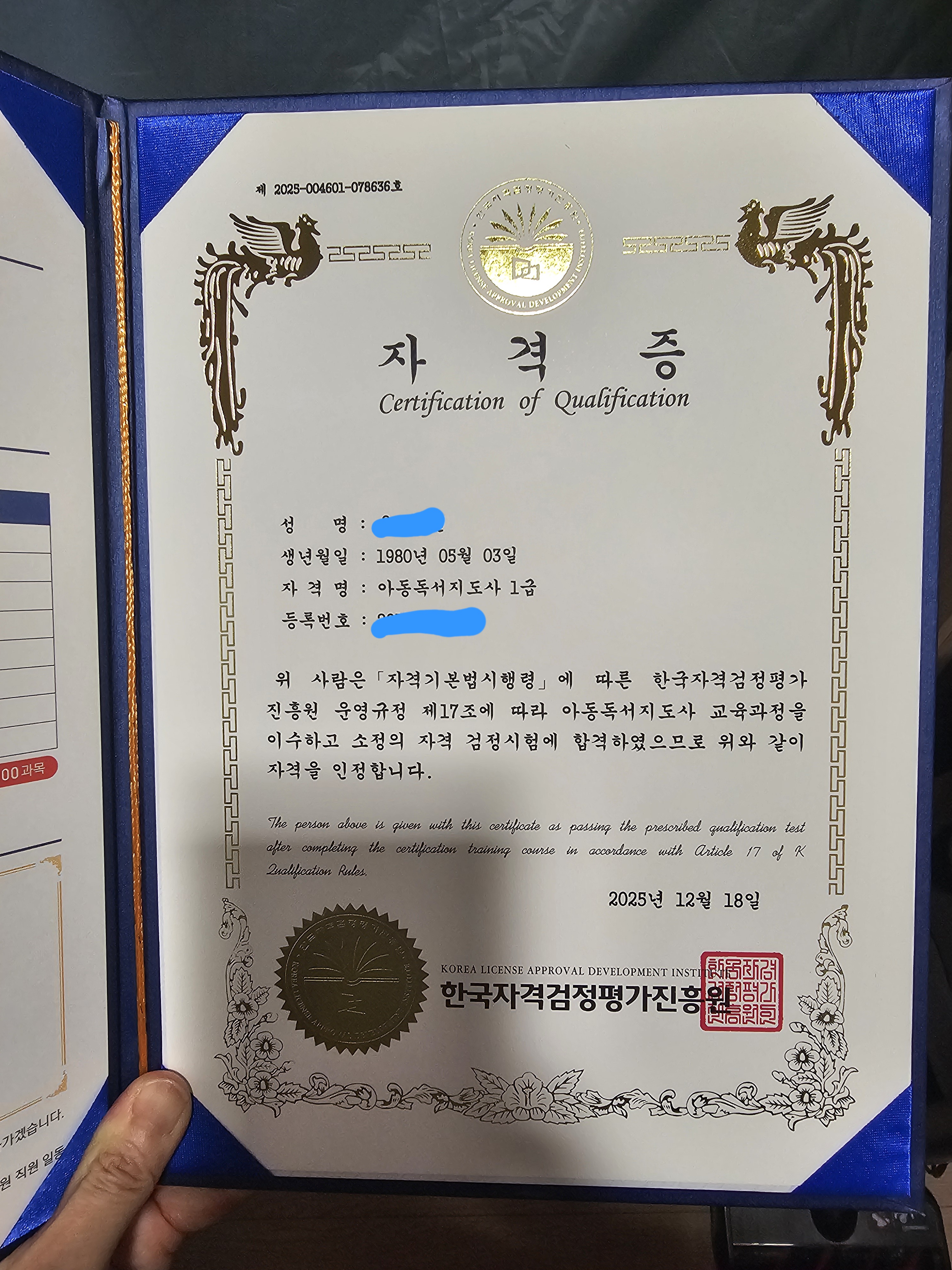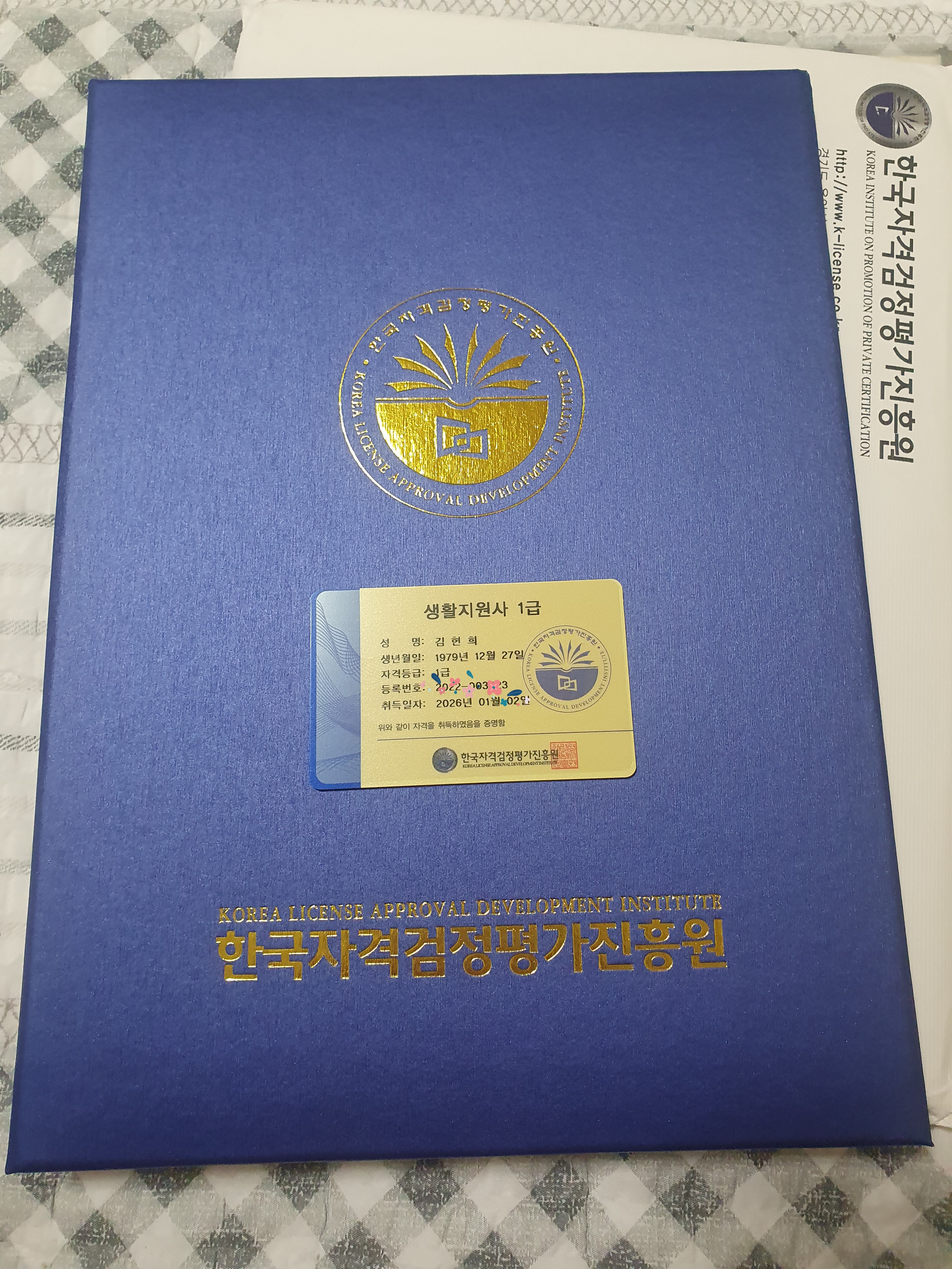 어디서 자격증을 따야하는지 너무 많은곳이있어 막막했어요 근데 어디서 한줄기 빛처럼 아는 지인이 톡프로필에 자격을 사진을 올려뒀더라구요 그래서 톡해서 바로 물어보니 한국자격증협회에서 땄다고 추천해주더라구요 당일 바로 생활지원사를 수강신청했어요 출석률인줄알고 하루 3강의씩 예습 복습하듯 들었어요 어라!! 학습진도율 60프로 ^^;;; 5일차에 바로 시험응시하고 100점으로 합격했어요 연필을 놓은지 28년만에 혼자 공부도 해보고 너무 뿌듯했어요 자격증을 받으니 더 행복하더라고요 몇가지 자격증을 더 따보고싶어서 한국자격증협회에 수시로 들락날락 거리고있답니다 단시간의 집중력으로 집에서 공부하고 자격증이 내것 되는것 그만족감이란..... 자격증 협회 적극추천해요