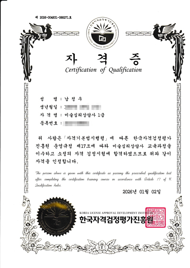 이런 와중에 SNS 광고에서 우연찮게 한국자격증협회를 알게 되었고, 이벤트 기간이라 수강료가 무료라는 기회를 접하게 되어 그동안 꼭 배워 보고 싶었던 미술심리상담을 망설일 틈도 없이 얼른 신청하였습니다.