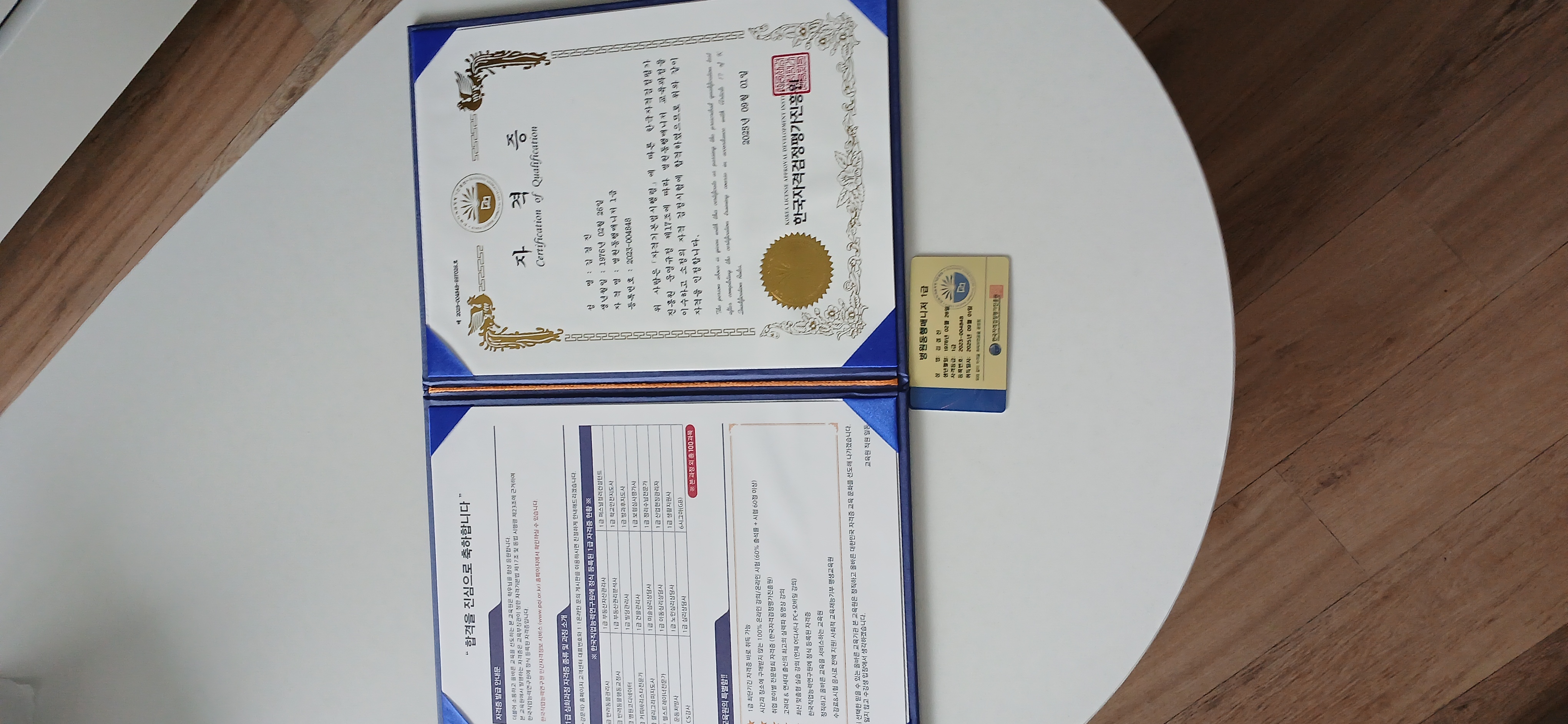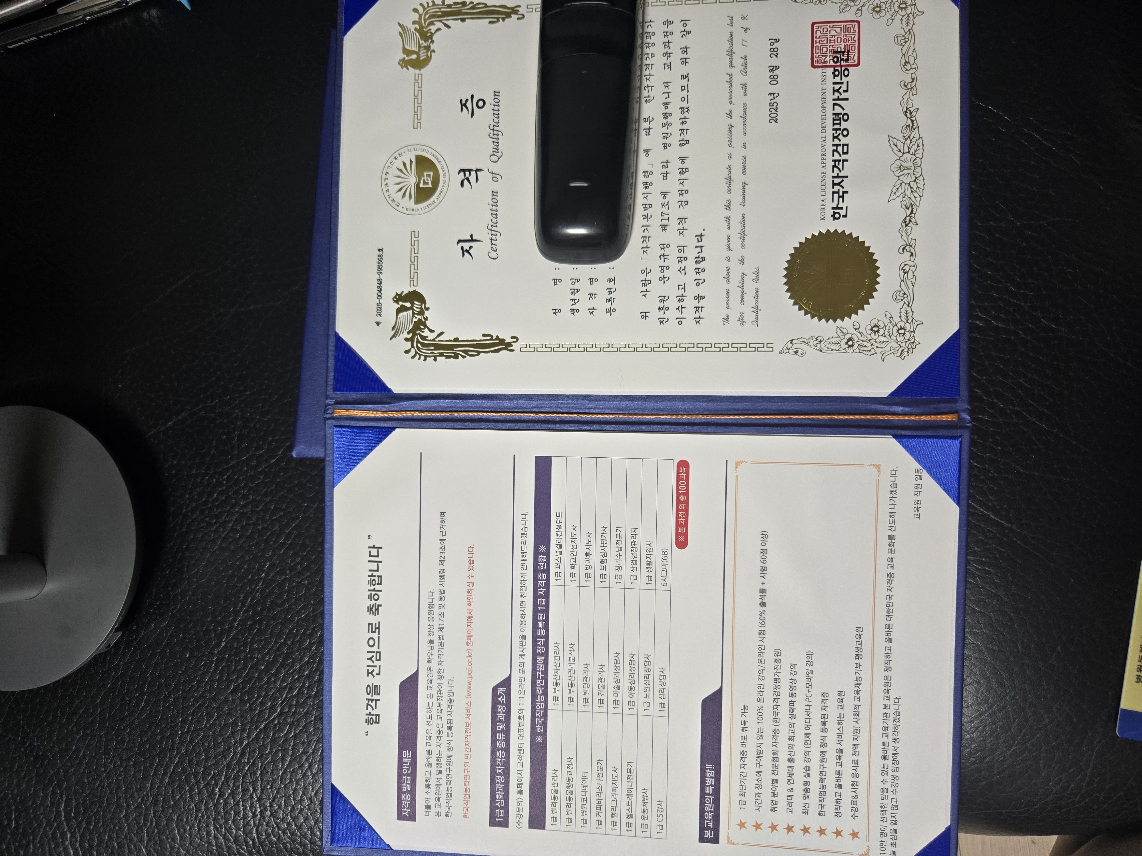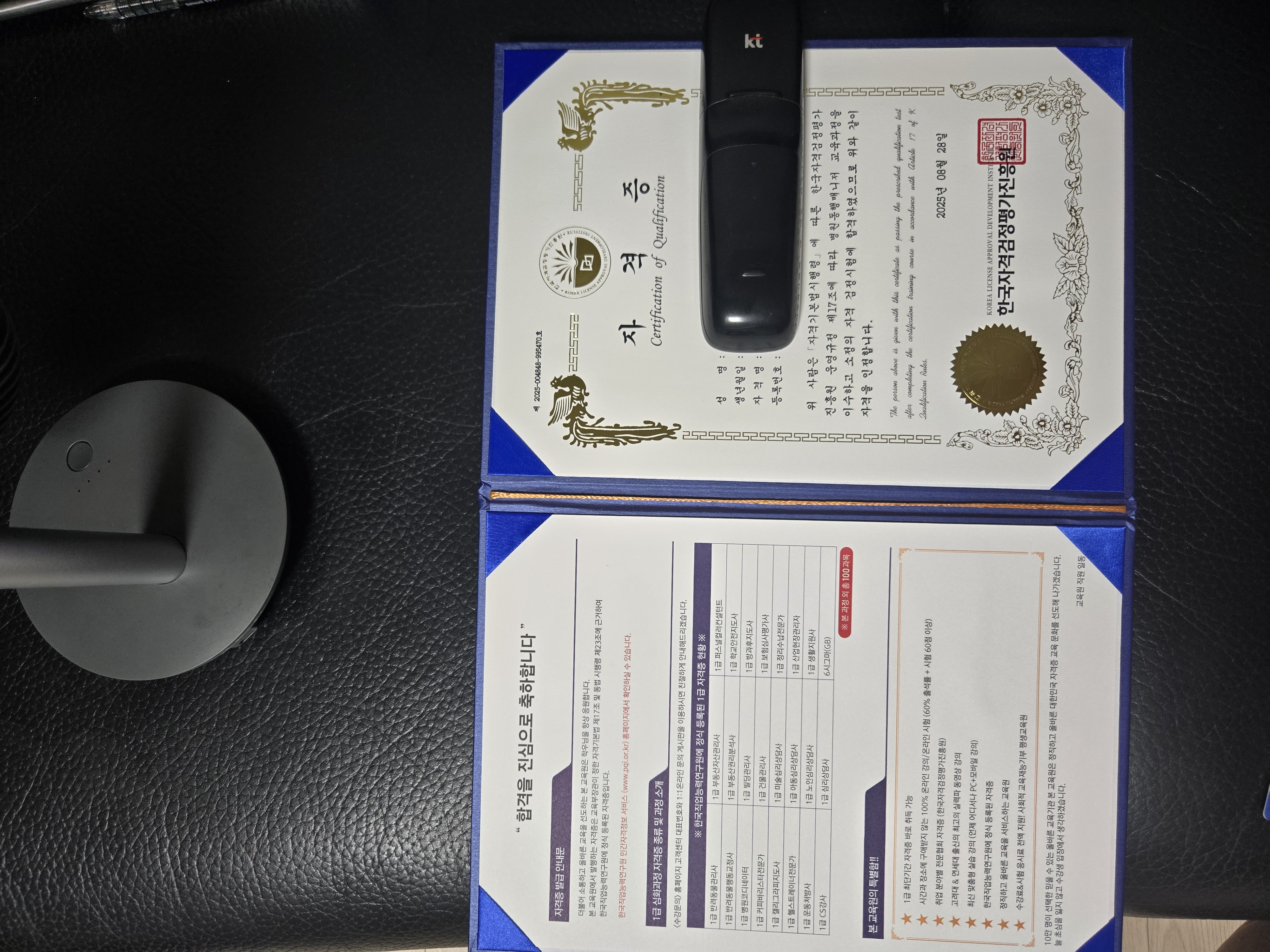 오전에알바끝나고하루한번씩강의들은게거의한달된거같아시험쳤더니 덜컥합격해버렸네요.놀라면서도사실넘기뻤어요.이나이에자격증땄다니깐주변에서다들칭찬해주시고기분엄청좋아요.무엇보다자격증집에도착되서보니제법멋있더라구요.다른거또도전해서계속시도해보려합니다.늦은거같았는데 이제시작이네요.여러분도홧팅입니다.