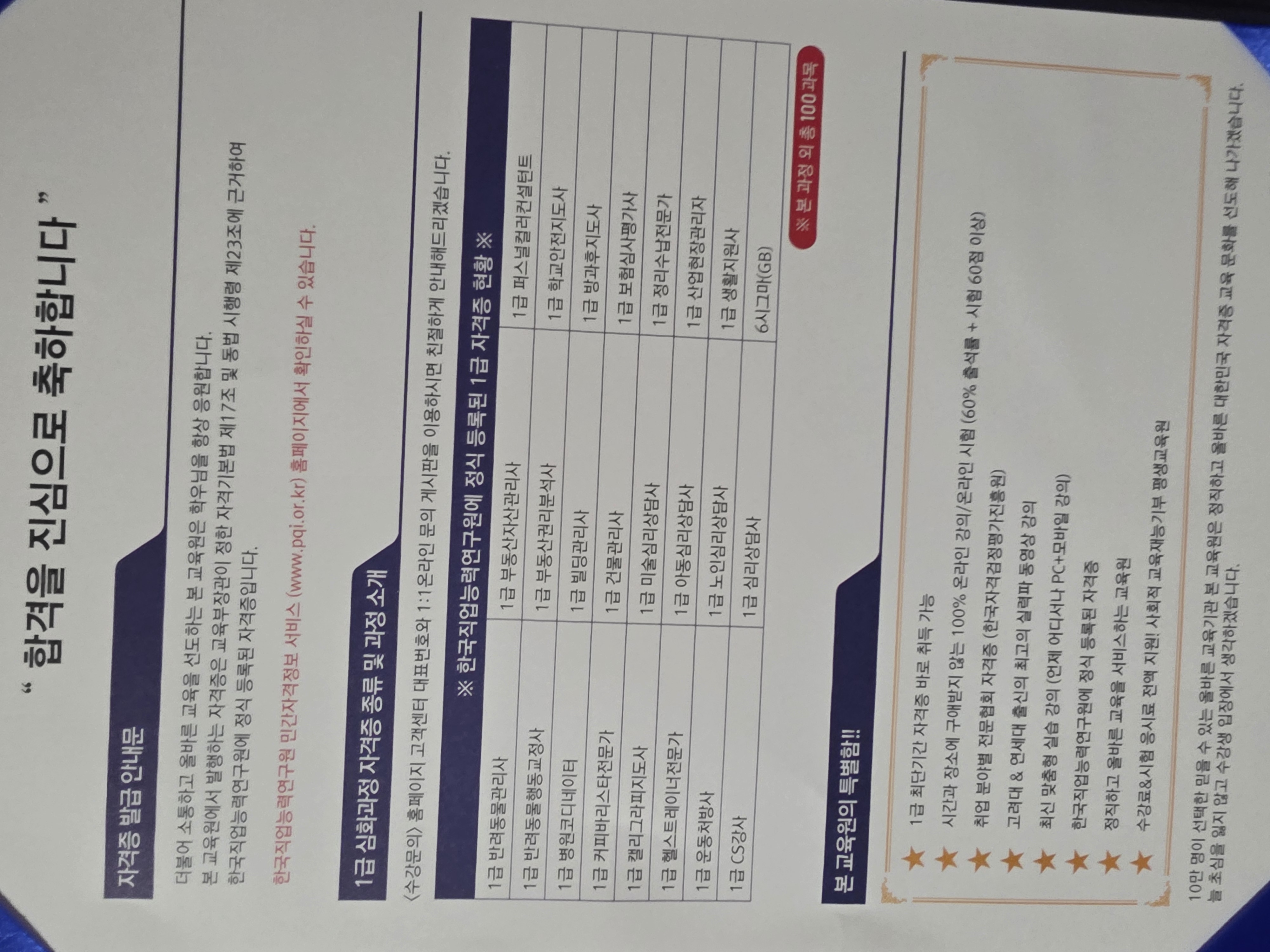 헬스트레이너 준비하면서 관련 자격증 공부중이였는데 한국 자격증협회를 알게되어 인강으로 공부후 바로 자격증 취득하였습니다 정말 유용하고 다른 자격증도 취득할수있게 공부하겠습니다 ㅎㅎ 감사합니다!!
