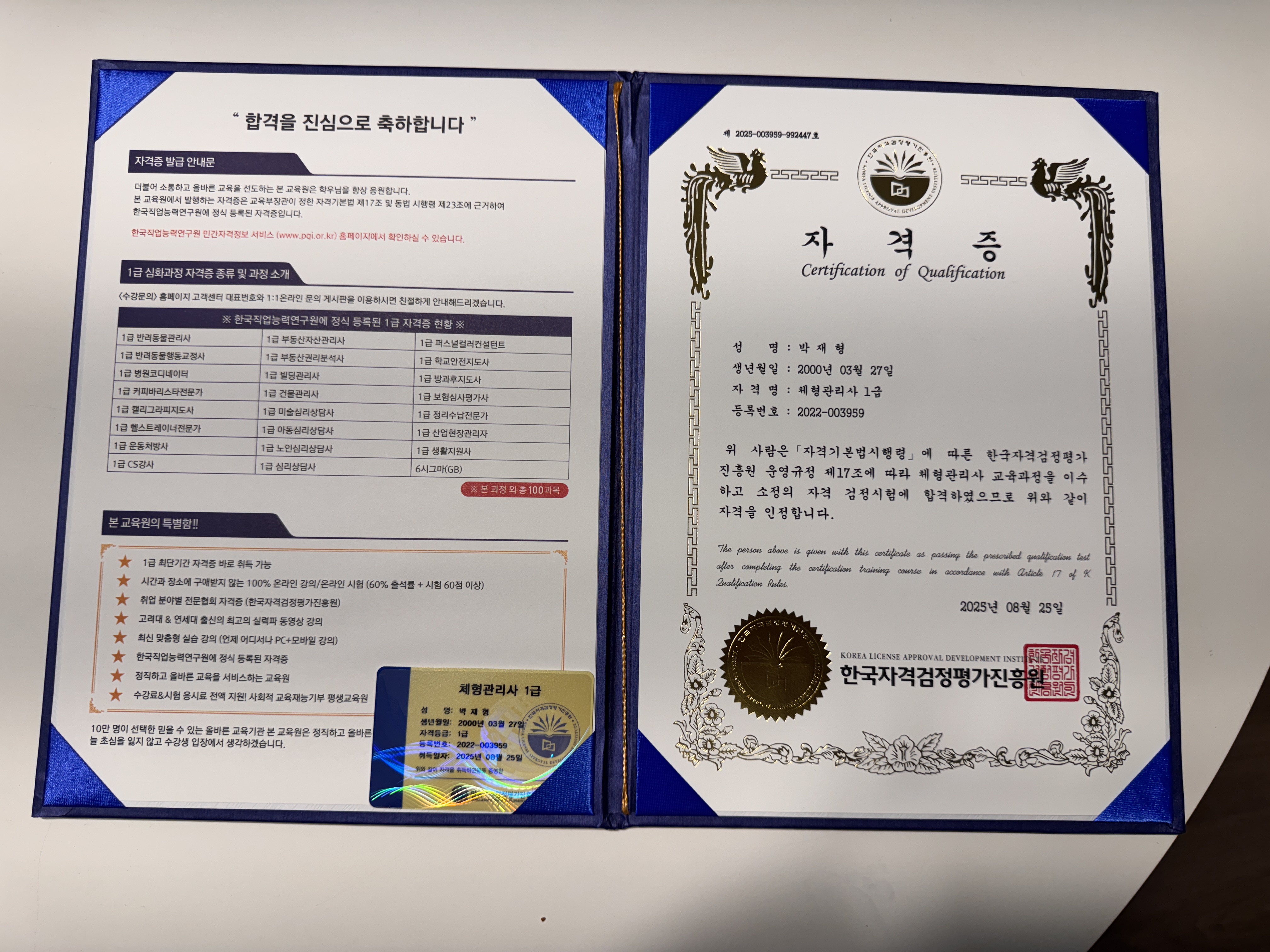 이력서 업그레이드가 필요해서 자격증을 알아보던 중 정식 기관에 등록되어있는 민간 자격증을 선택했어요! 온라인 수강과 시험으로 벌써 두개나 취득했어요!! 다른 과목도 수강 더해서 다양하게 발전해보려고 합니다! 추천드려요