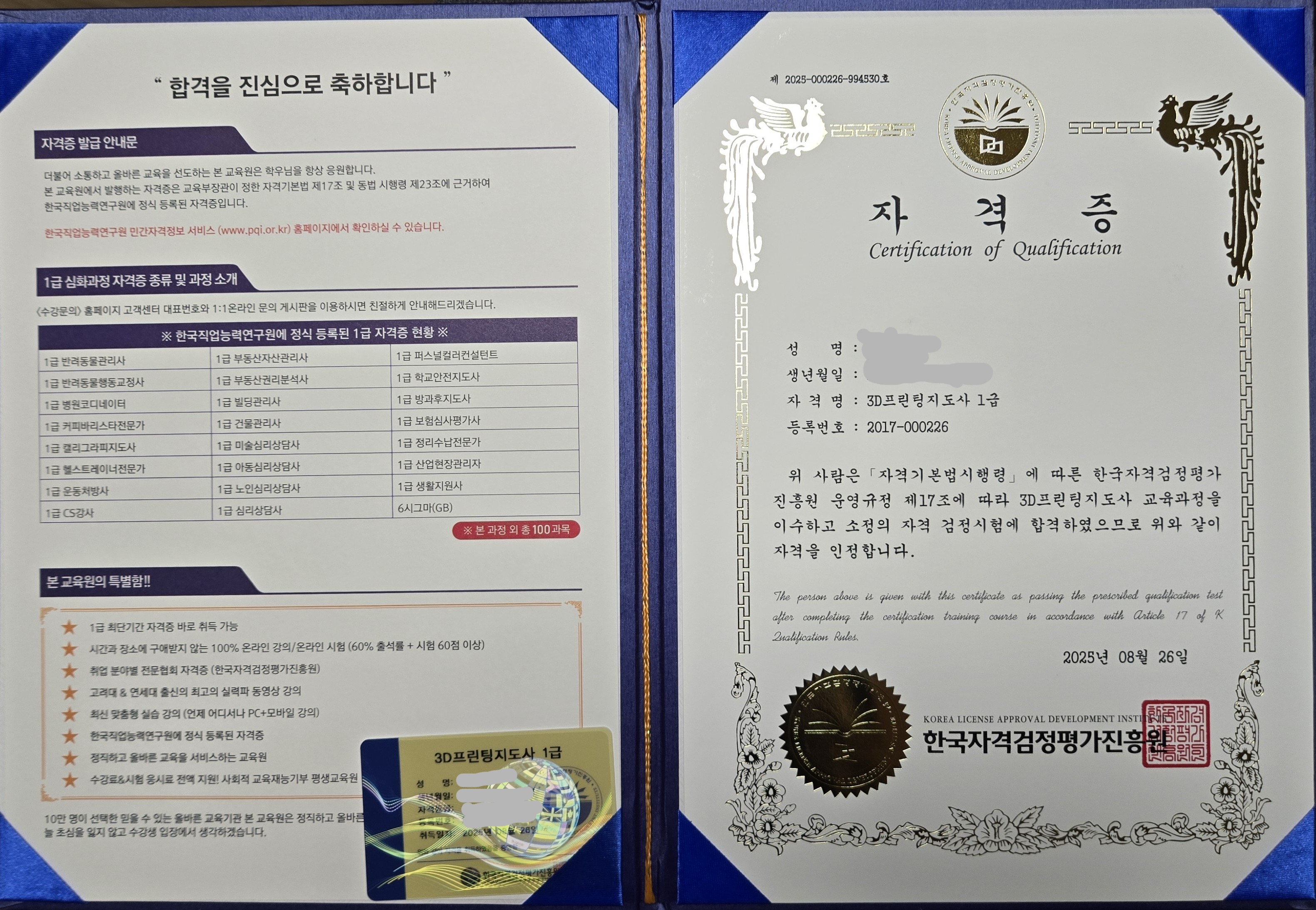 안녕하세요 이번 강의를 통해 3D프린팅지도사1급자격증을 취득하게 되었습니다. 많은 강의 내용과 , 잘 정리된 강의 내용 및 교제로 인해 쉽게 3D프린트에 대해 쉽게 배울 수 있었고, 자격증까지 한번에 취득할 수 있게 되었습니다. 강의 내용 및 교제를 통해 열심히 하였고 결과가 자격증 취득이라는 목표를 달성하였어요 많은 분들이 같이 도전해서 좋은 결과 있기를 바랍니다. 감사합니다.