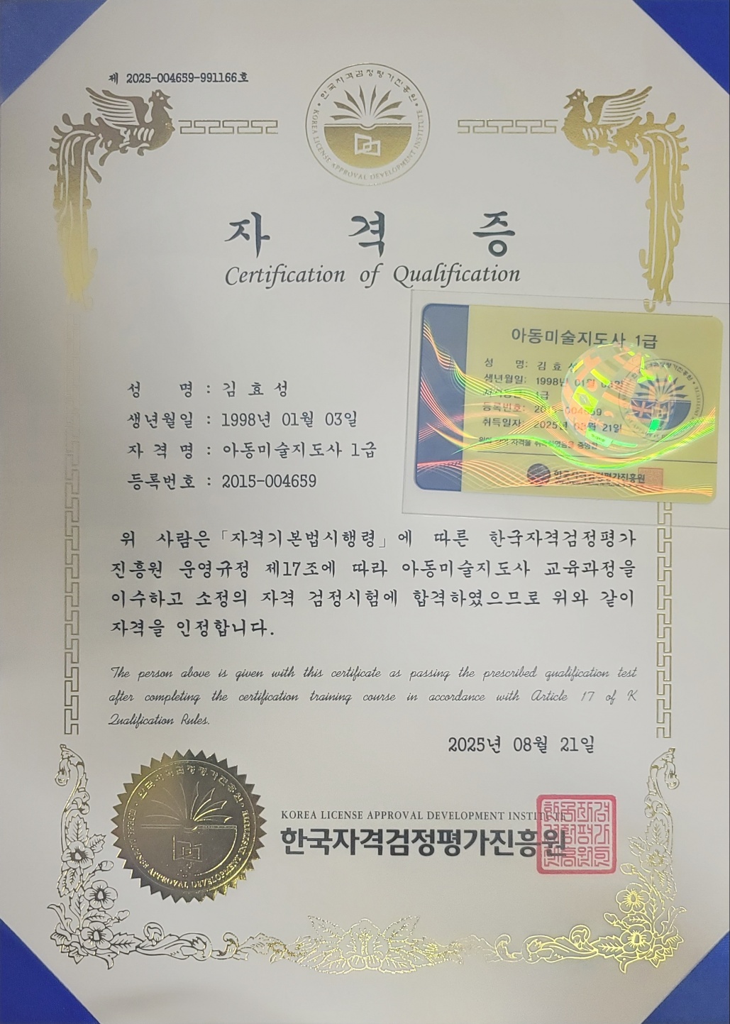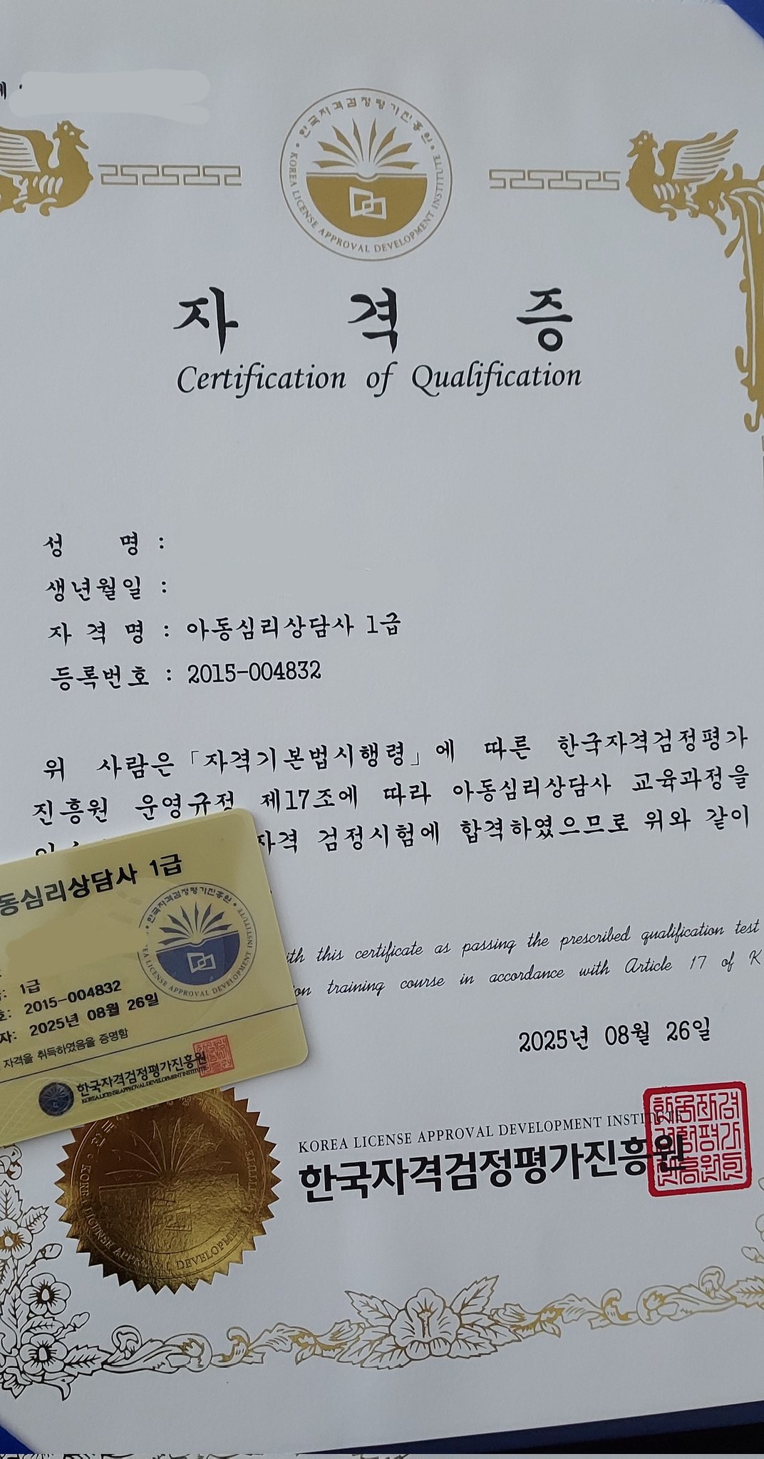 아동심리상담사 1급 합격했습니다.