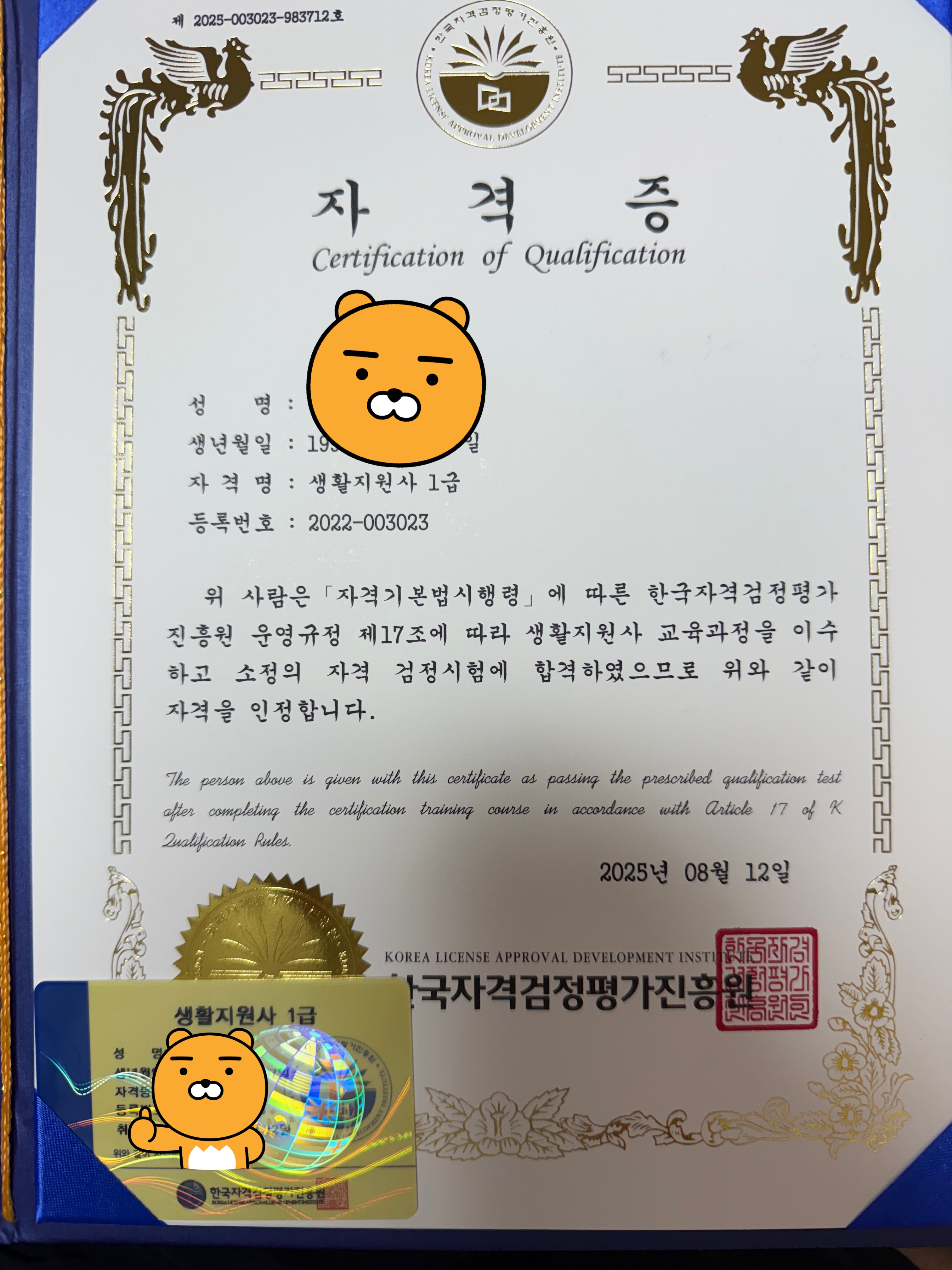 진짜될까 될까..하다가 한번해본건데 진짜 자격증이떡~하니생겼네여ㅋㅋ 제인생에 첫자격증이라 신기하고 뿌듯하고 기분이너무좋아여ㅎㅎ