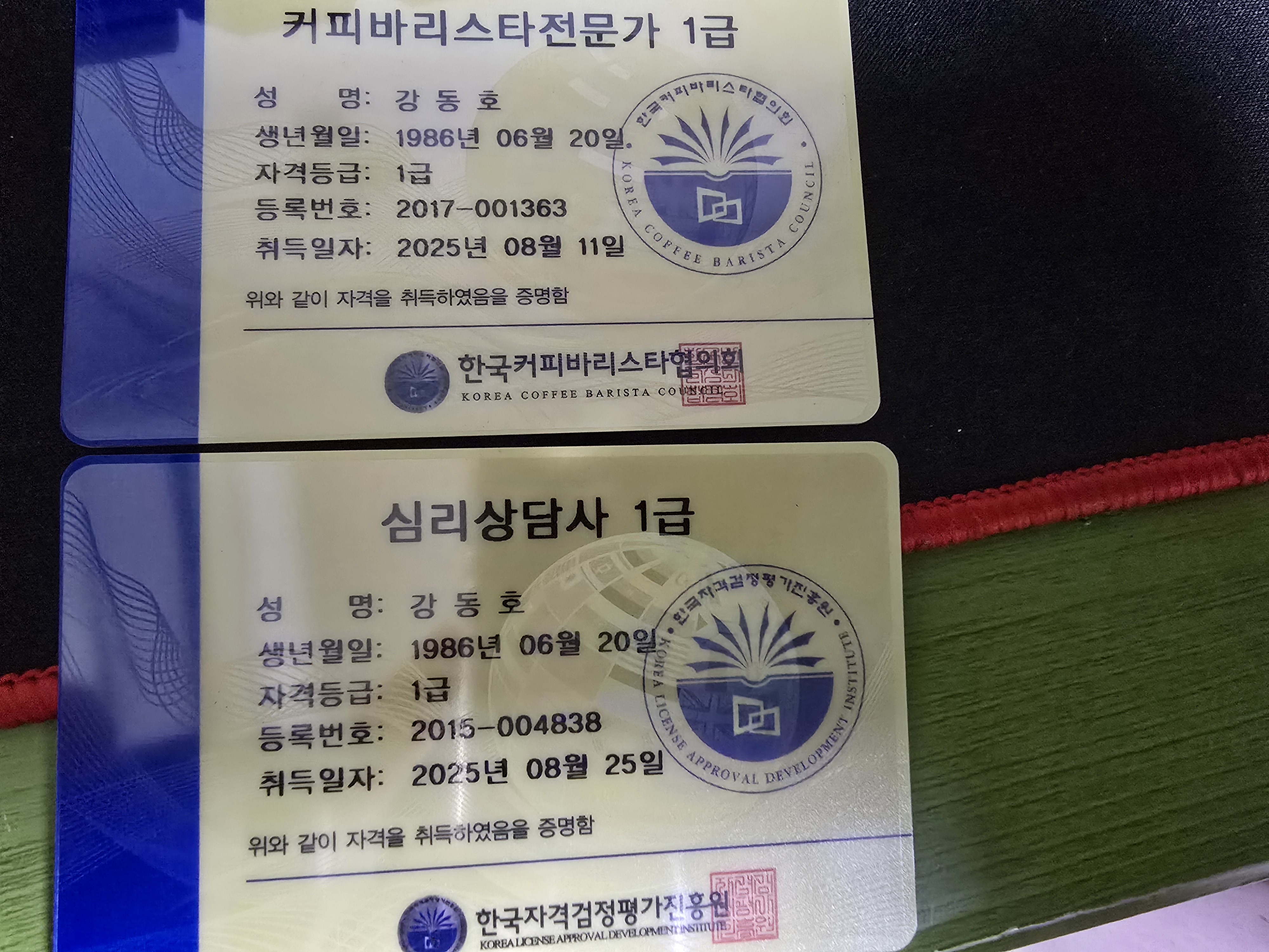 코로나 떄문에 회사일이 없서가지고 페쇄할려고 하다가 자격증좀 따보자 사이트 찾아보다가 한국자격증을 보게됬네요 그래서 심리상담사랑 커피바리스타를 열심히 공부해서 두개나 합격해서 자격증을 받았네요 다음 자격증도 열심히 해서 한번더 도전해보겠습니다 요즘일자리도 없고 자격증만 계속 찾는것같아요 다른분들도 힘내세요 화이팅입니다