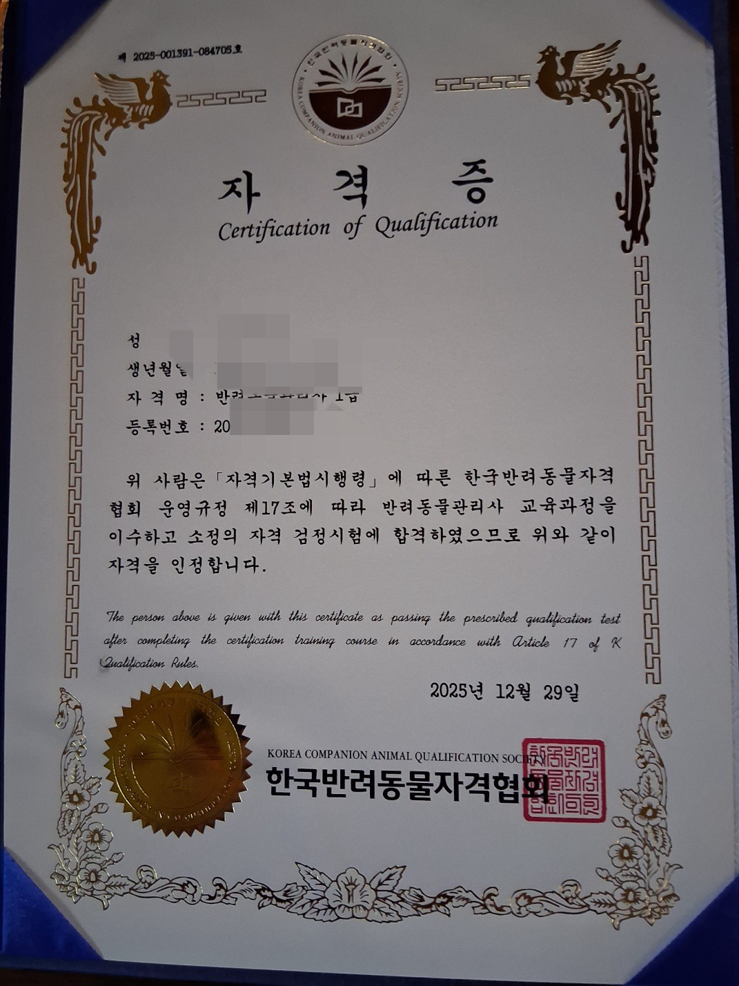 우연찮은 기회로 한국자격증협회 온라인 수강으로 평소에 관심있던 많은 강의를 수강할수있는 좋은 기회를 얻게되어 큰도움이 되었고 그로 인해 반려동물관리사1급 온라인 수강 후 자격증까지 취득하게되어 기쁩니다. 학원을 갈 시간적 여유와 상황이 안되는 분들에게 자격증협회의 온라인 수강은 유용함과 자기계발에 큰 도움이 됩니다~~!!^^