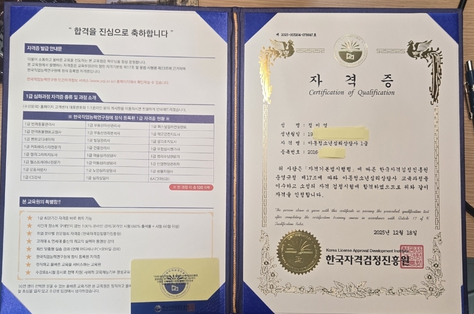 퇴직 후 경력 전환을 위해서 도전했어요. 이 자격증이 아마도 저에게 자신감을 주는 아주 소중한 자격증이 될 거 같아요. 너무 기쁩니다!! 또 다른 세상에 나간다는 건 나이가 적고 많고 간에 두려운 거 같습니다. 그러나 우리의 아이들에게 가르쳤던 것처럼 저에게도 한발 한발 준비하고 나아가면 어느새 전문가가 되어있을 제 모습을 상상하면서 열심히 공부했습니다. 자신감이 조금씩 붙고 있습니다. 고맙습니다.