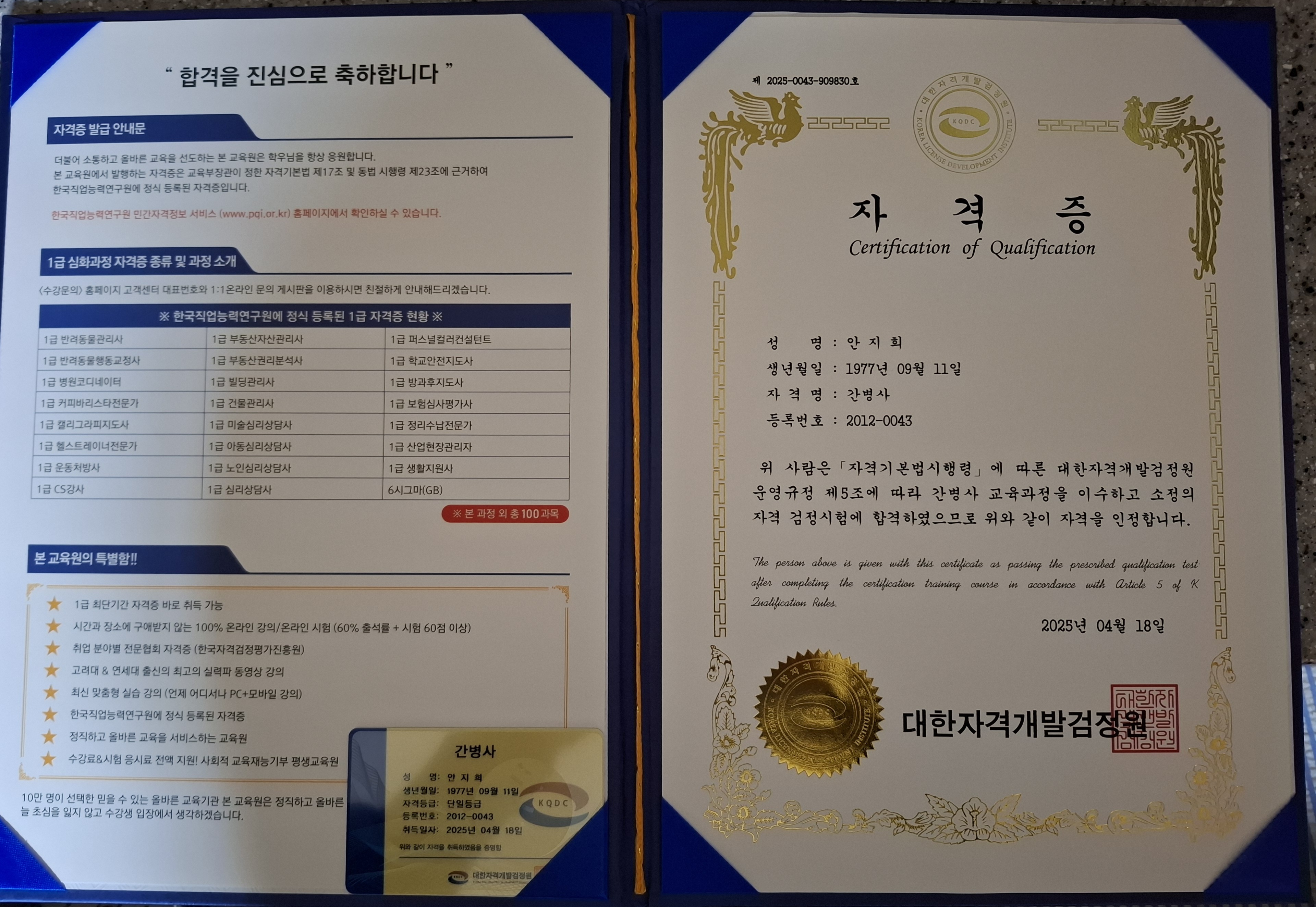 합격하고 자격증 받은지 8개월이 지났는데요 이제 서야 후기를 남기네요 지금도 병원 쪽에서 근무 중 이지만 간병사 수강 듣으니 너무 유익하고 좋았습니다