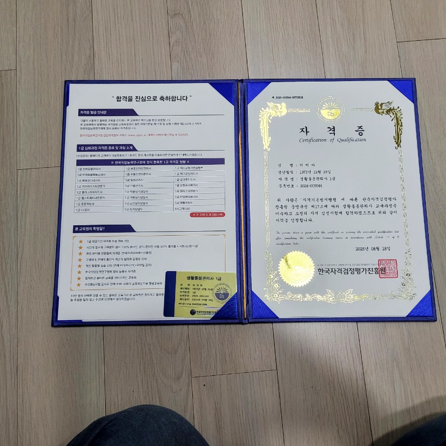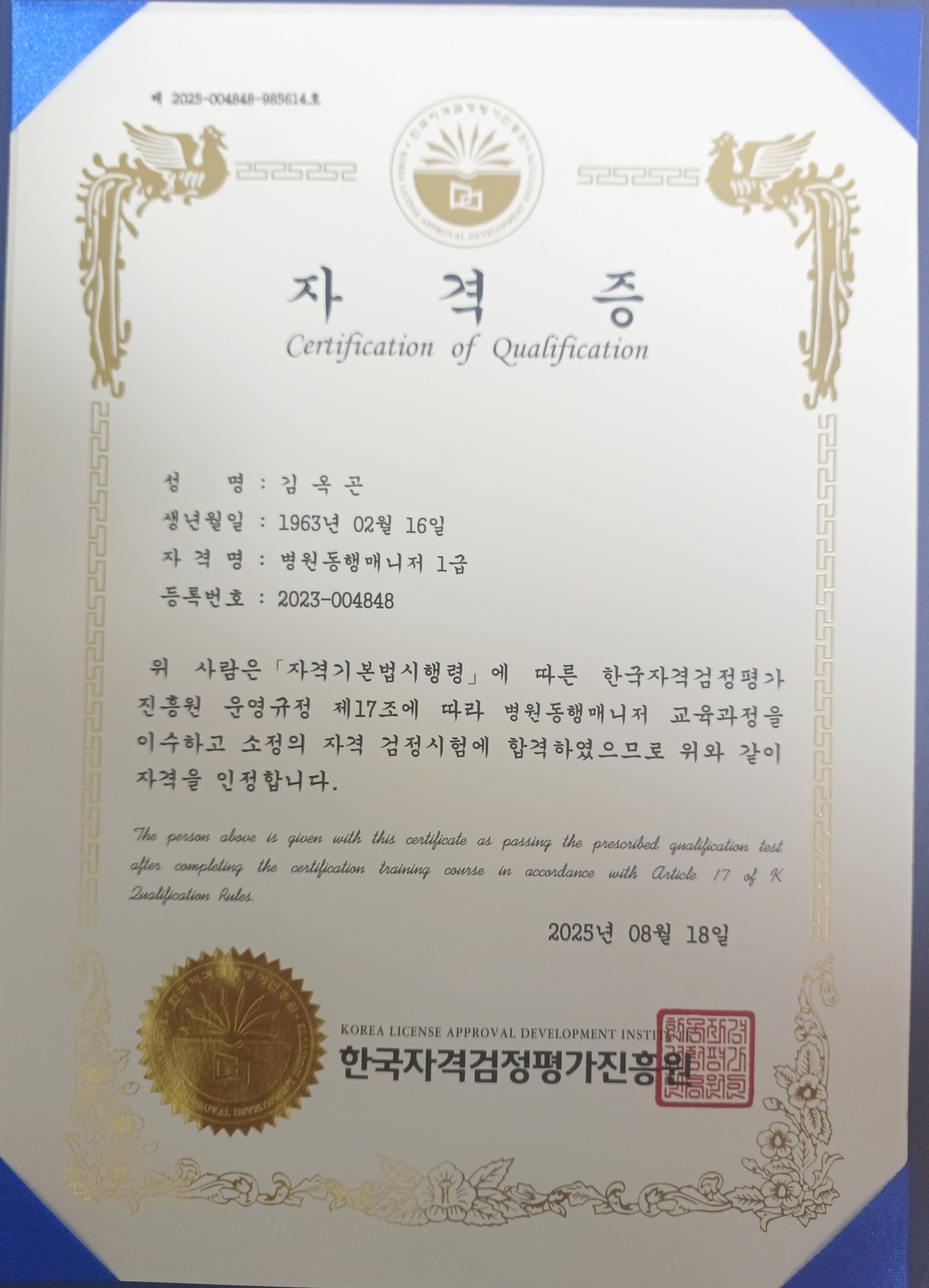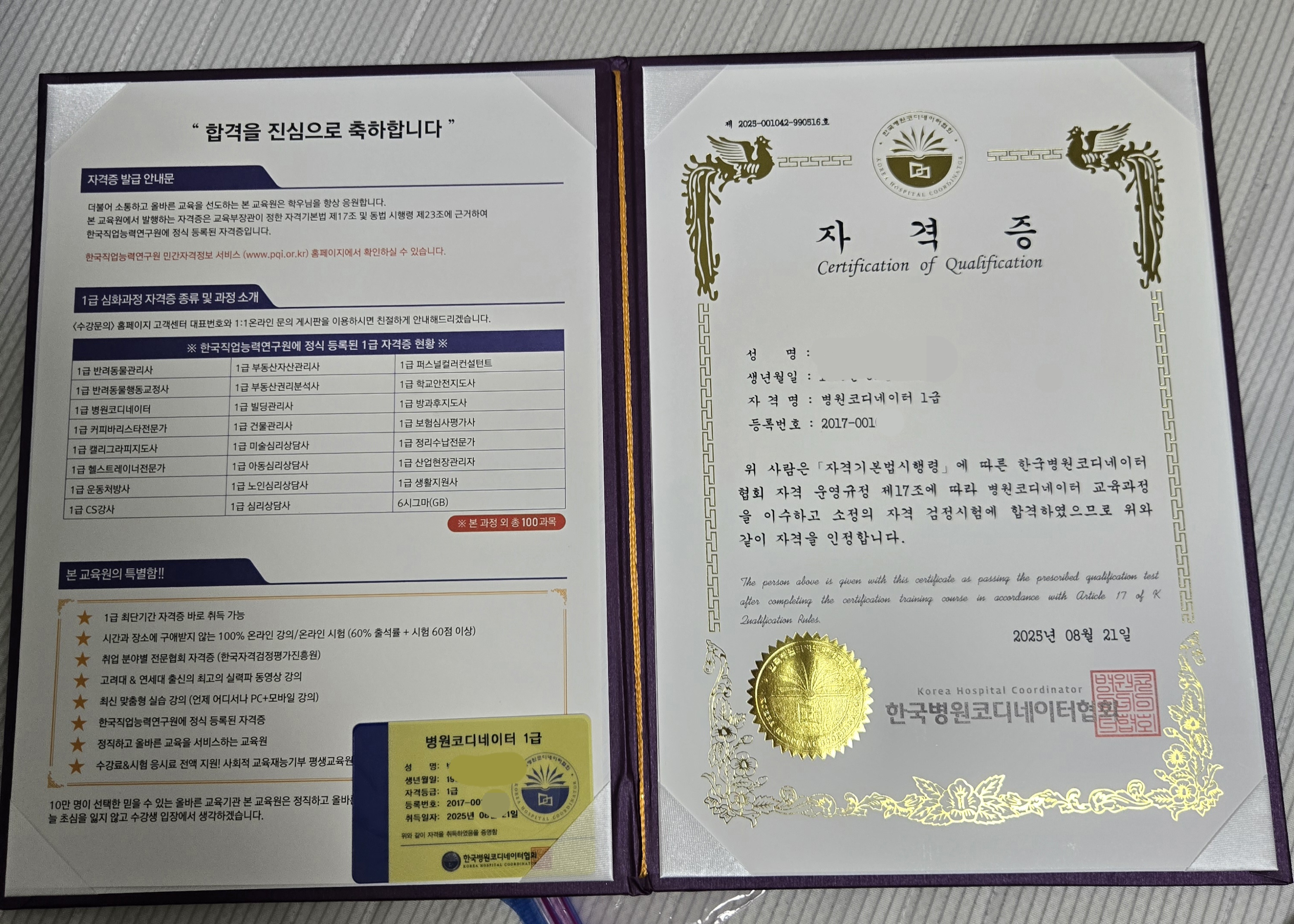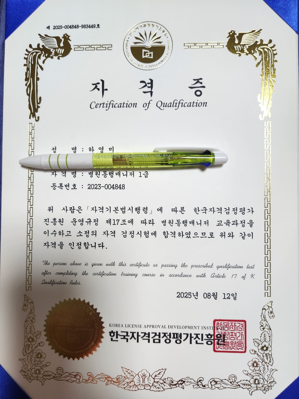 우연히 알게된 병원동행매니저 자격증을 이렇게 취득 할수 있게 되어 너무 뿌듯한 마음입니다~ 다른 자격증들도 공부 열심히 해서 도전 할 생각입니다~~