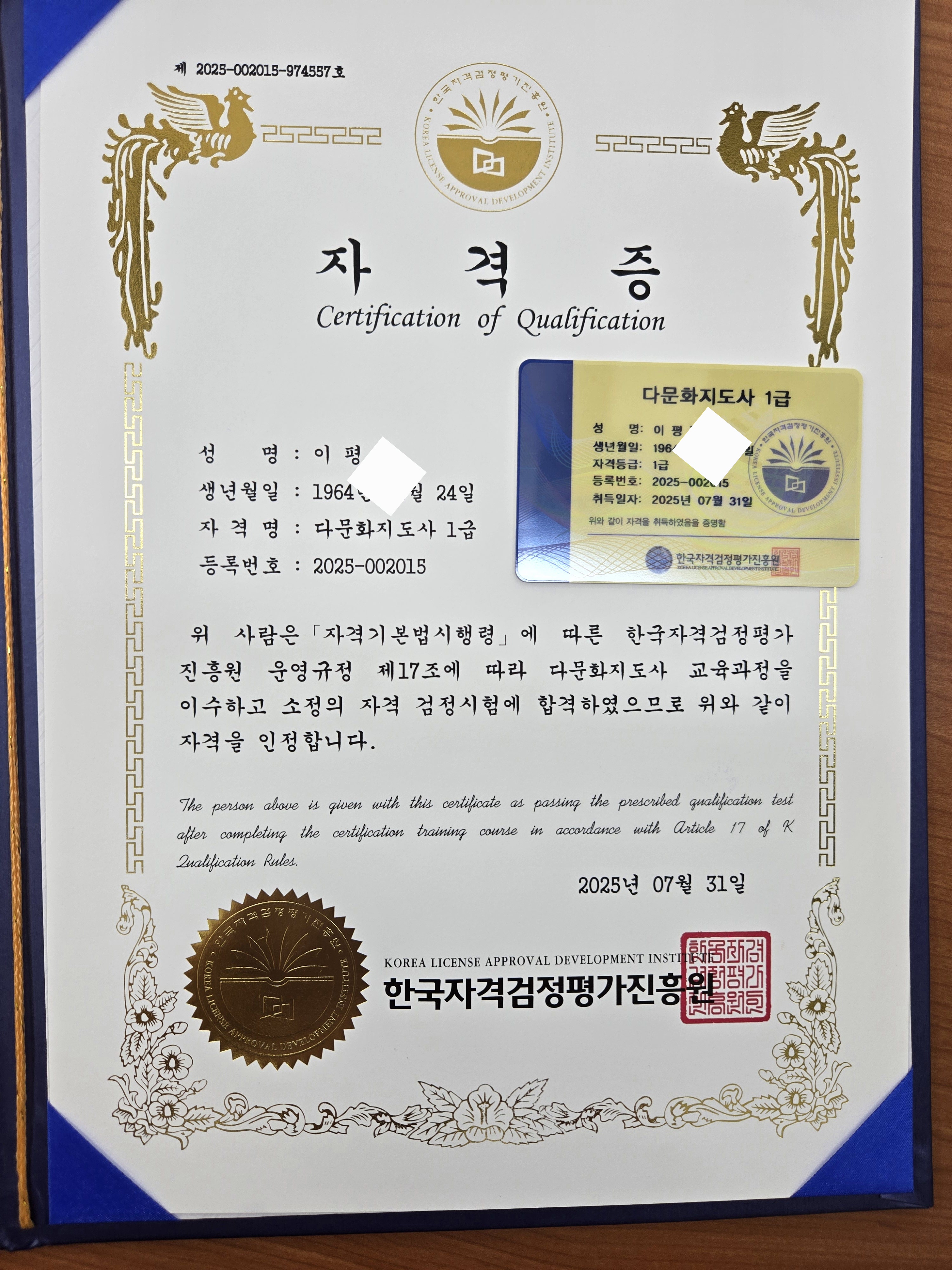 60이 넘은 나이에 삶의 노후를 좀 알차고 ㅂᆢ람있게 보내고자 다양한 준비를 하려던 중 10여년전에 다 마무리 못한 이 자격등을 다시 준비하게 되었네요.청춘에 일하던 전공과 다른 일을 현재 하고 있고 이 일과 요즘 다양한국적의 사람들이 이 사회에 더블어 사는 문화를 만들고자 합니다. 인천 운서동에서 한식밥집을 운영하고 있고 먹거리를 통한 다문화가정.그리고 청소년들에게 쉼터를 기회가 된다면 하려 합니다.