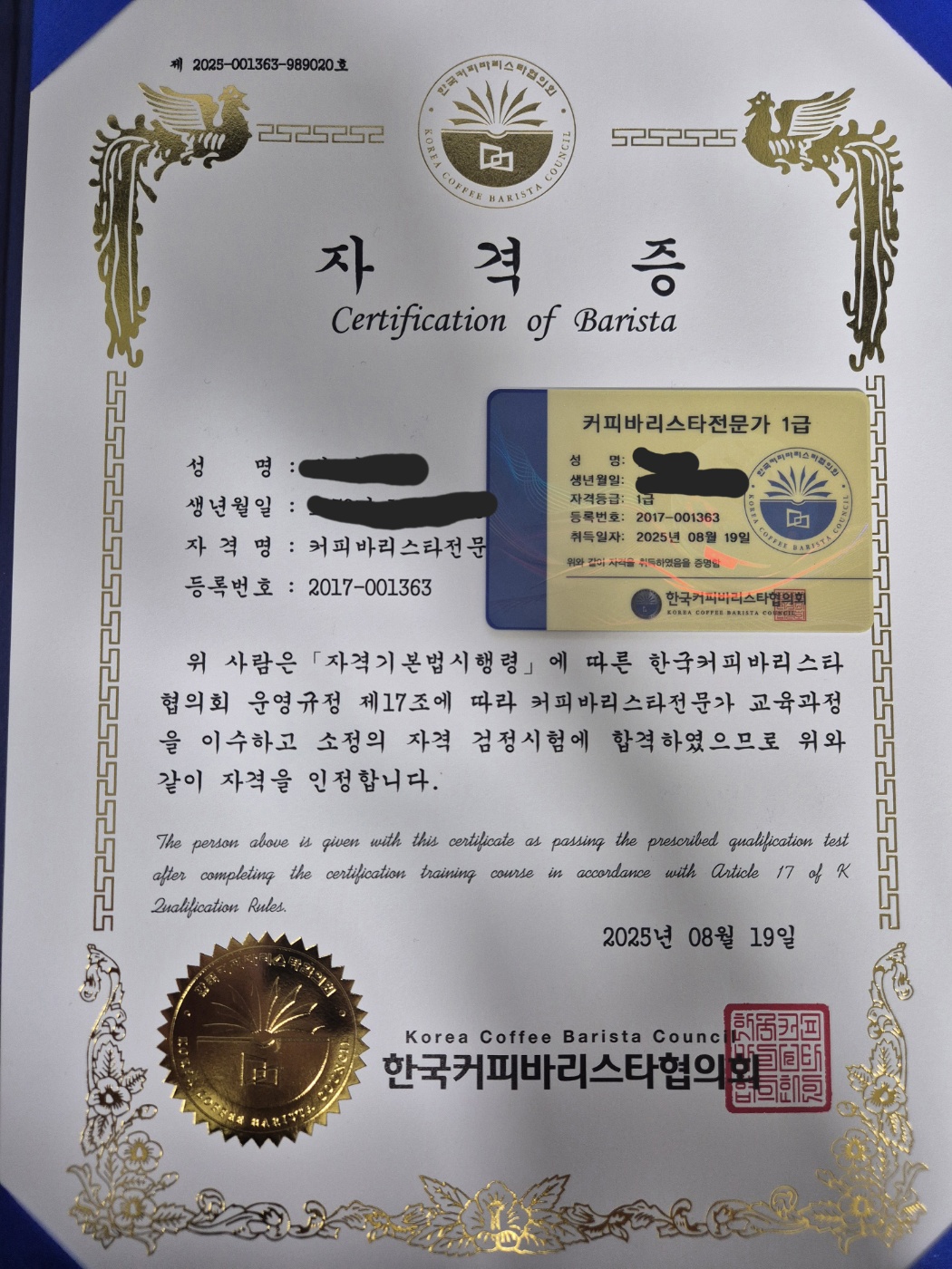 예전부터바라스타에관심있었는데요합격까지하고자격증까지받아서좋습니다