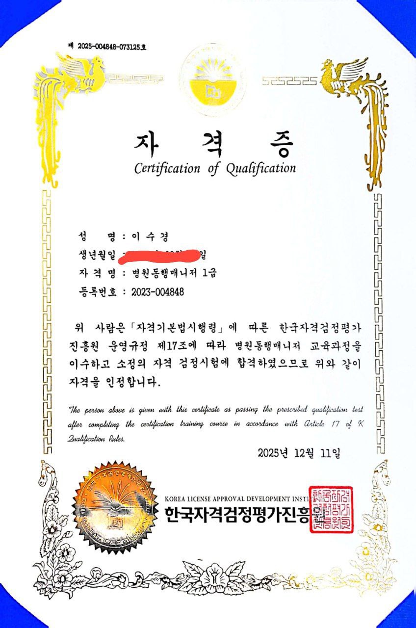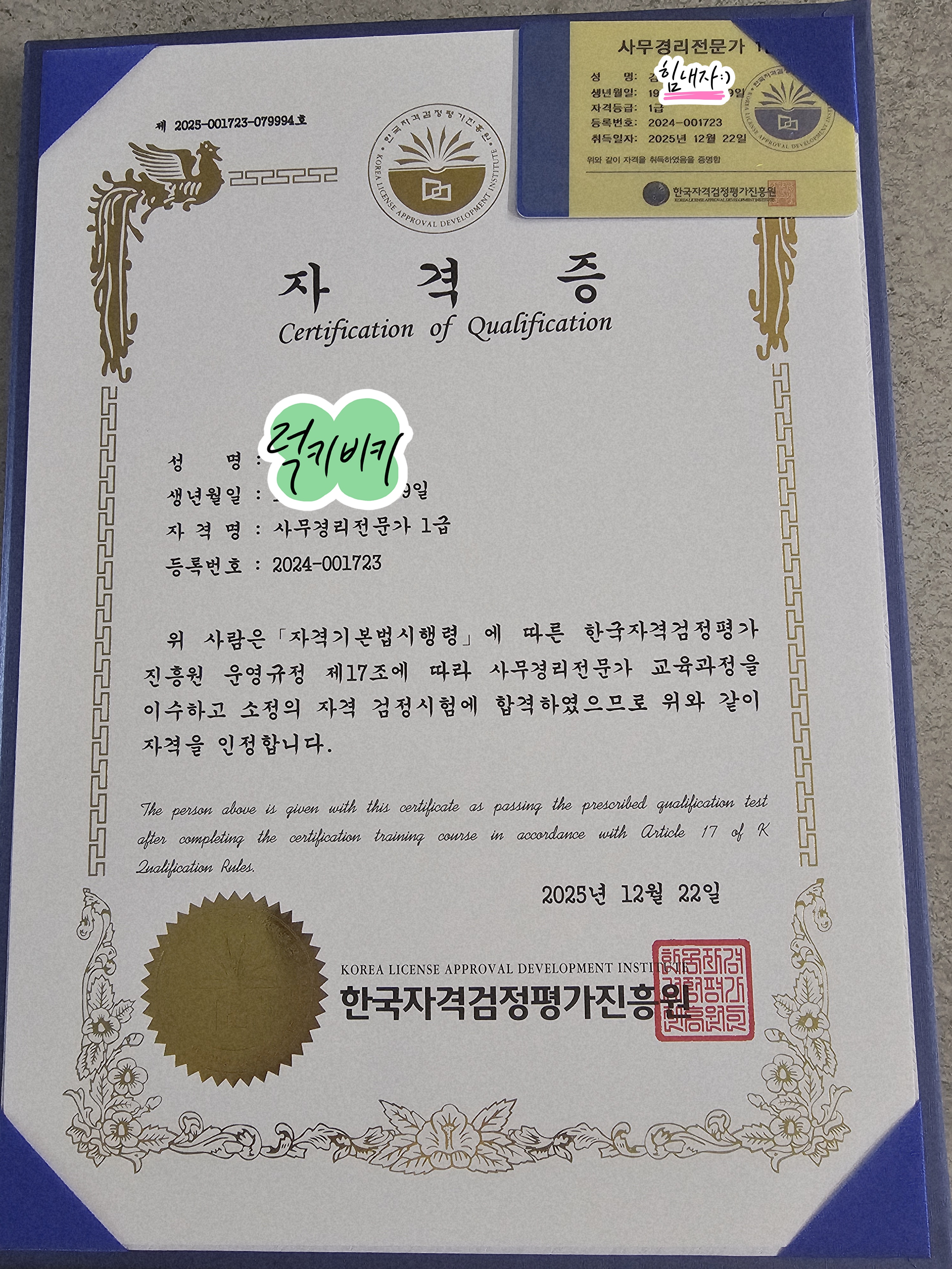 학교 졸업한지 오래되어 자격증에 다시 도전할거라는 생각을 못했었는데요 40대 후반이 되어 나중에 노후를 생각하니 뭐라도 해야되겠다싶어 도전하게 되었어요 마음만 먹으면 딸수 있습니다 망설이는 분이 계시다면 지금 그냥 하시라고 말씀드리고 싶습니다. 감사합니다^^