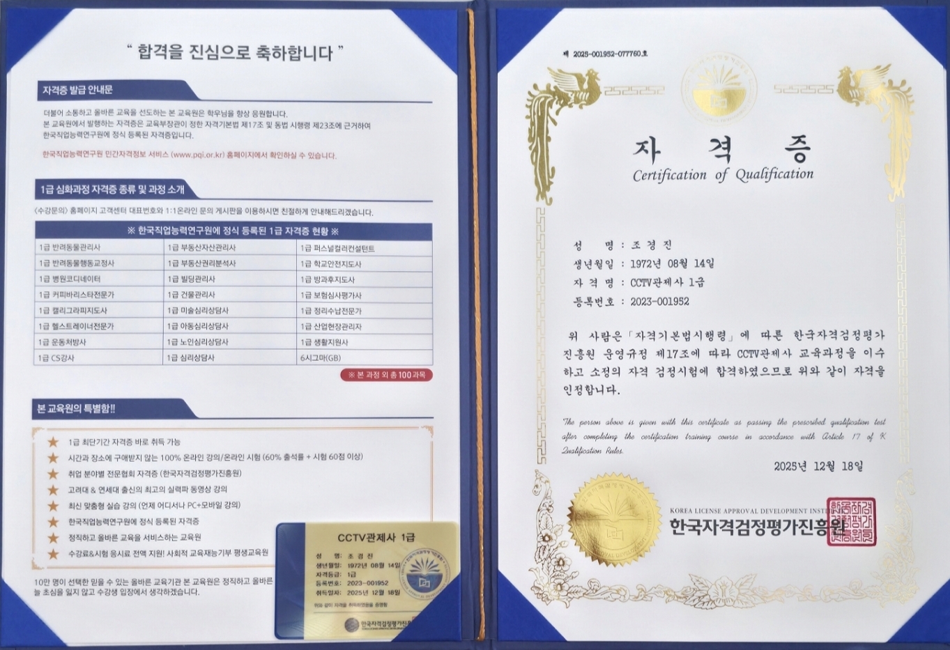 생각지도 못한 인터넷 강의로 자격증을 딸수 있어서 너무 좋아요 지금 나이에 필요한 자격증 같아서 더 만족해요 다른분들도 이런기회를 꼭 이용해 보면 좋을것같아요