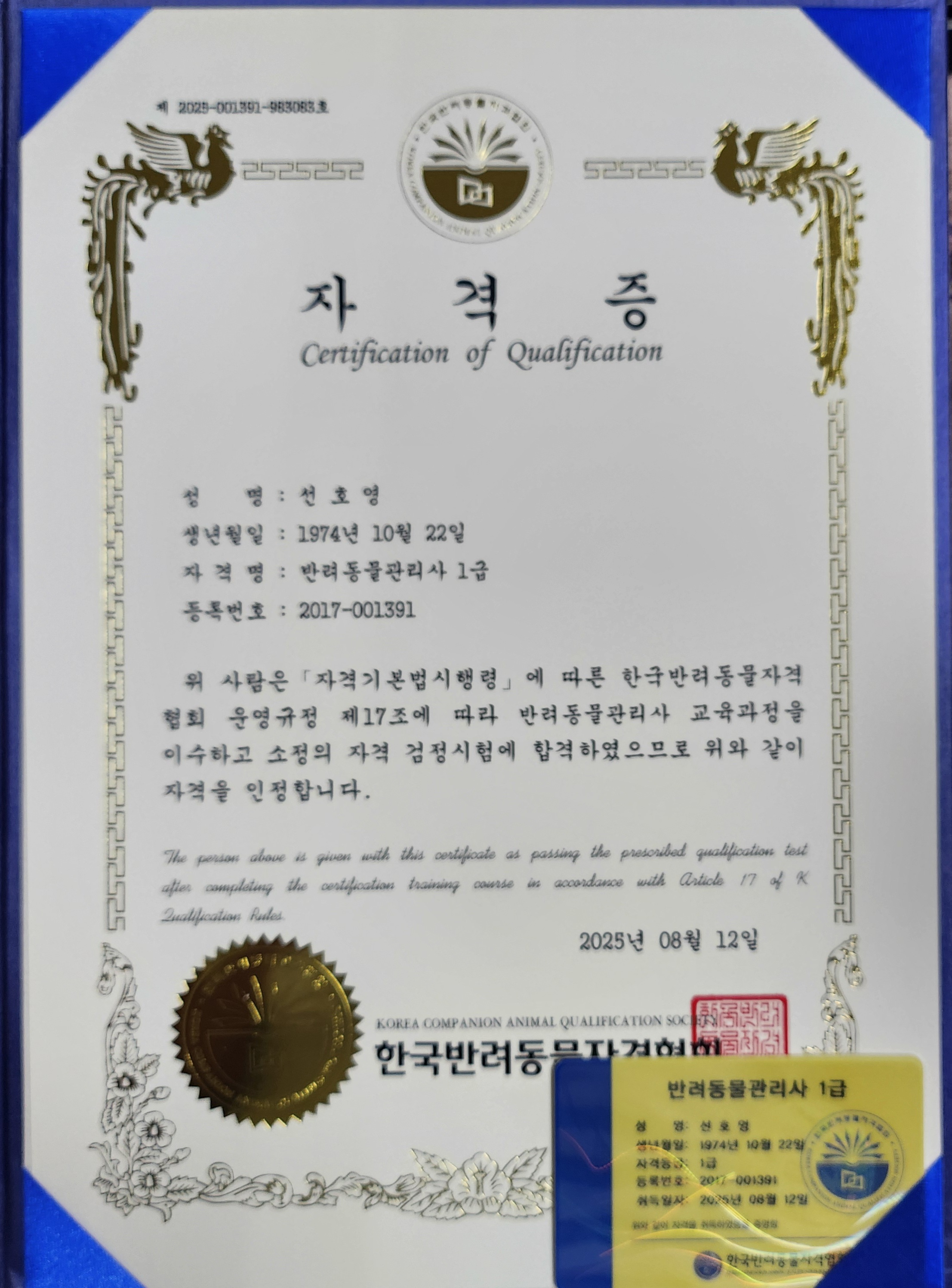 작년 여름에 입양한 루나를 위해서 보호자로서 더 책임감이 생겨 자격증에 도전해서 합격했네요 여러분도 도전하셔서 합격의 영광을 누리세요