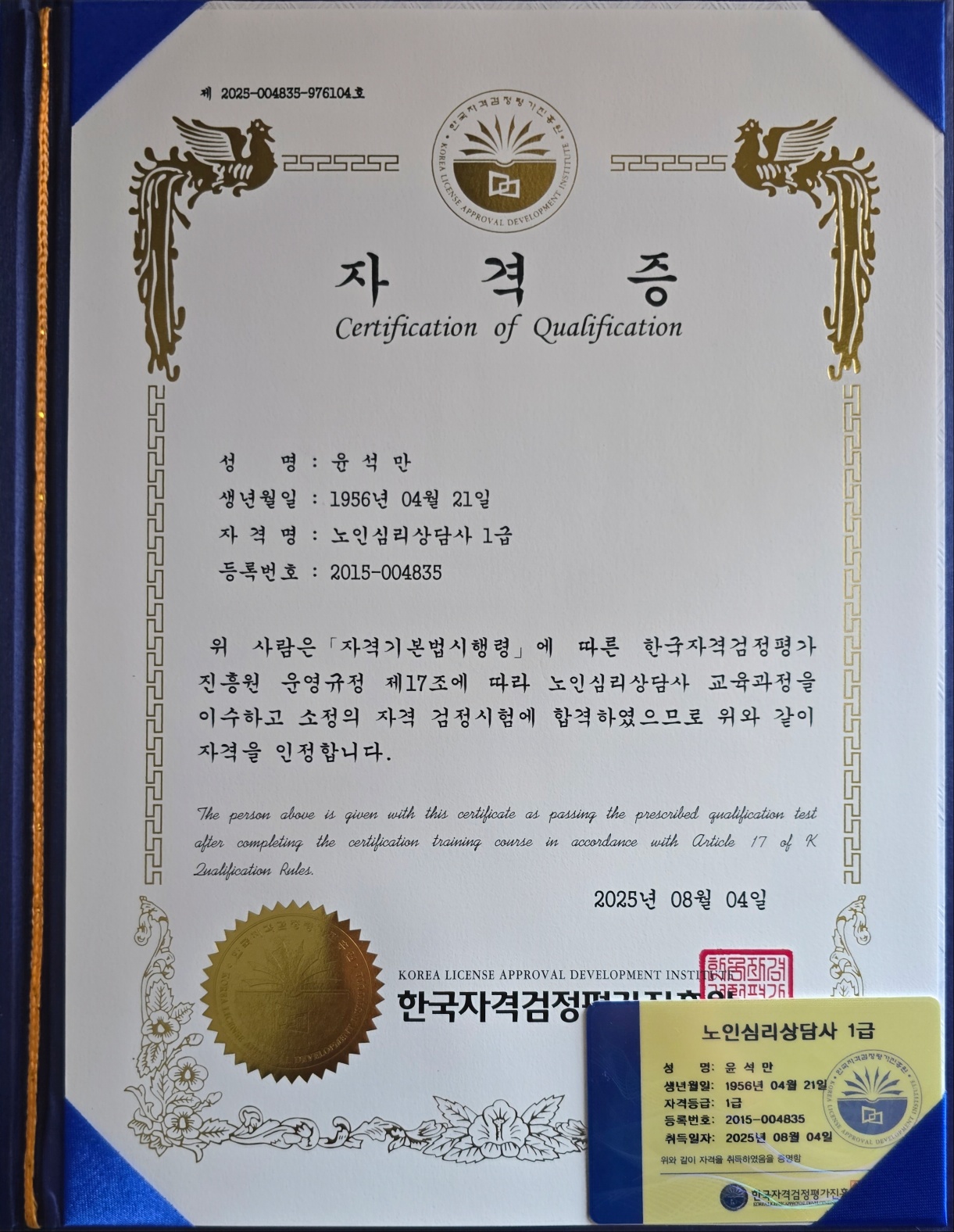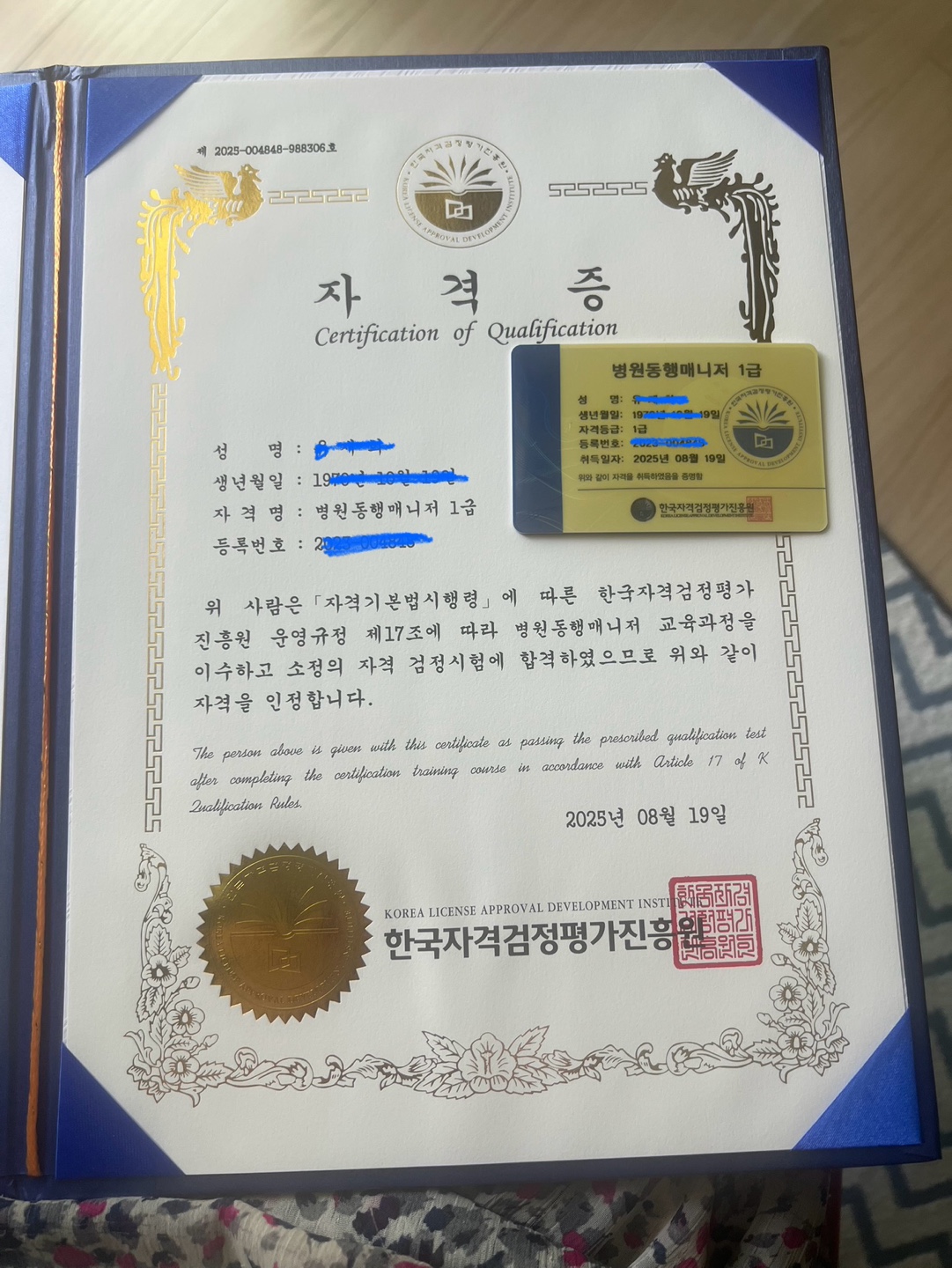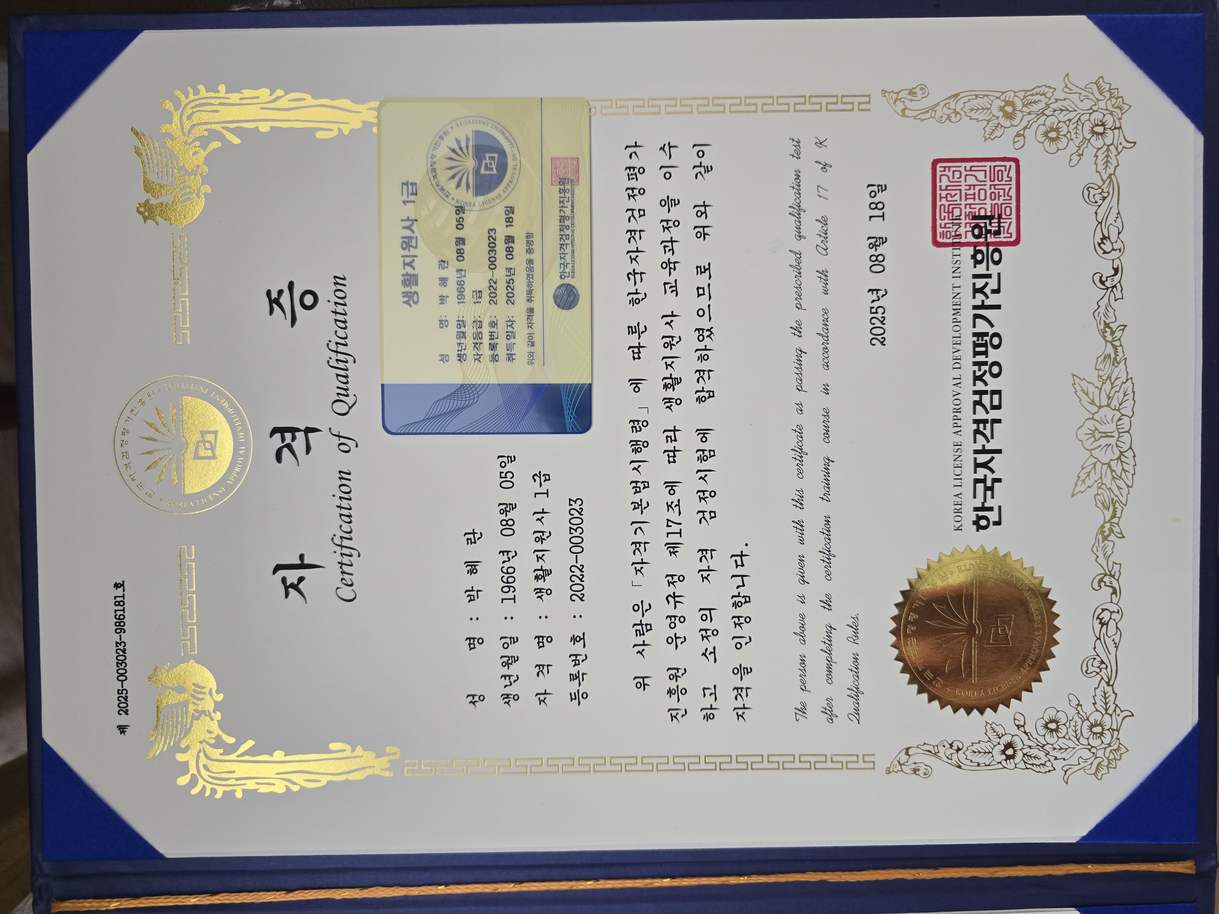 자존감이 떨어진듯한 일상에서 자격증 하나로 자신감을 얻은거 같아서 고마웠습니다. 무엇을 더 해야 할지 고민하면서 추가 수강 중입니다. 앞으로 비전을 위해서 병원동행 매니저 1급을 먼저 땃지만 필요한대로 더 따서 나자신을 업그레이드 할 생각입니다. 나이들었지만 할수 있는게 있다는것에 감사하며, 잘 활용 할수 있는 기대감도 갖어 봅니다.. 자신감 갖고 할수 있다는 희망 회로를 힘차게 돌려 볼 생각입니다..