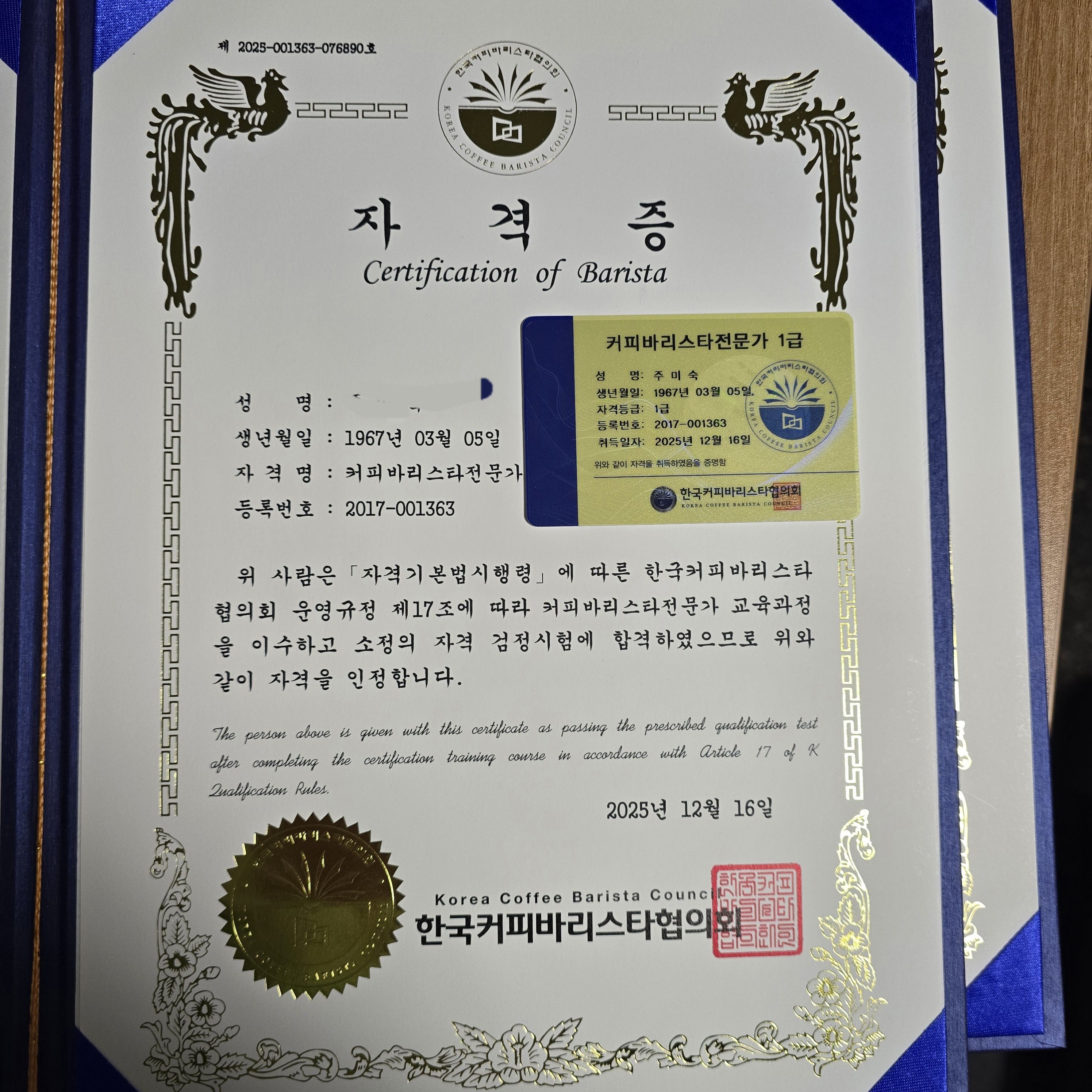 너무 해보고싶은자격증 취극 하니 행복 합니다. 자격증을 떠나서 커피에 대한지식을 가지니 너무 좋았고 공부를 하다보니 자격증 취득이 되어 너무 감사 합니다.